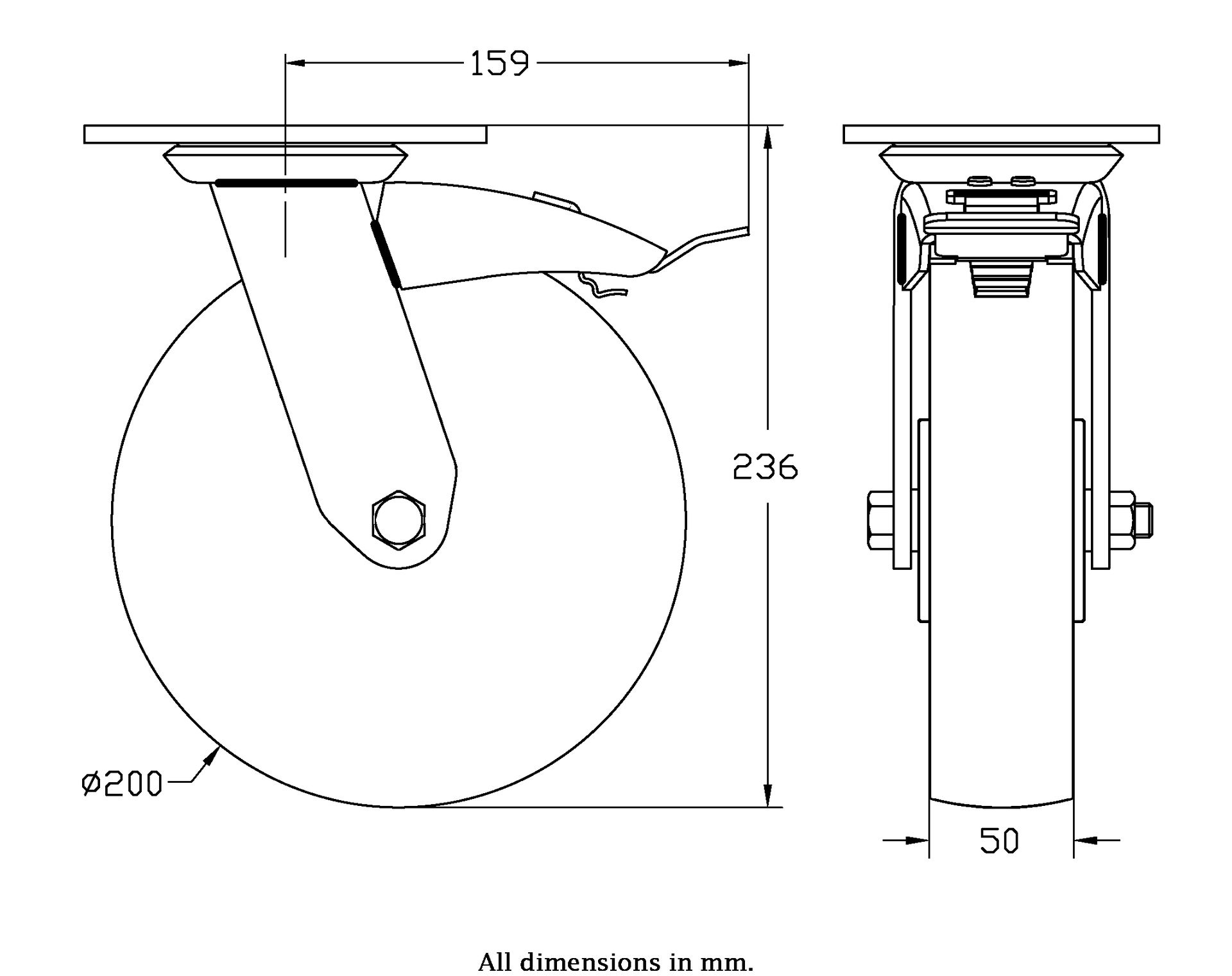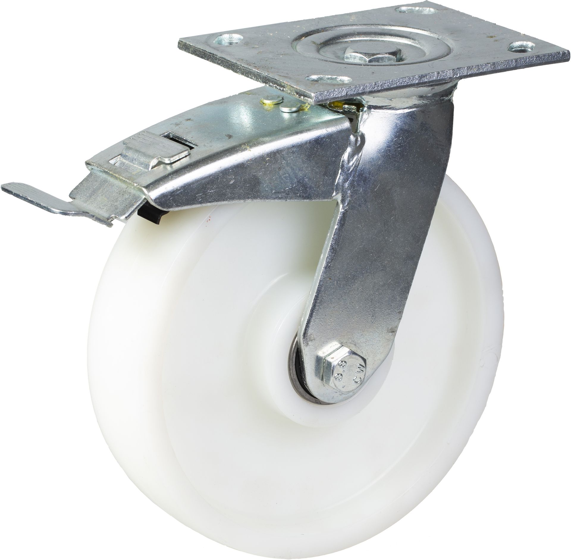 Swivel/brake castor with strong top plate bracket made of zinc plated steel with double row ball race in swivel head.