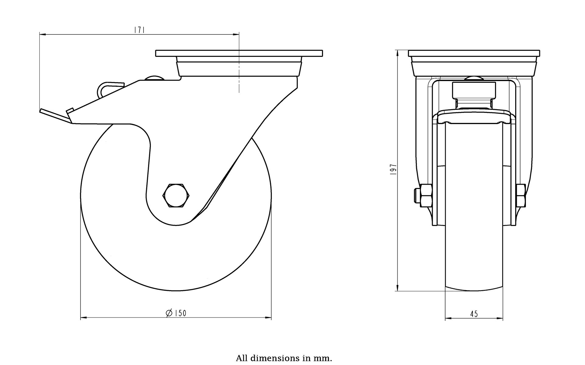 Foot operated brake that locks both swivel and wheel simultaneously.