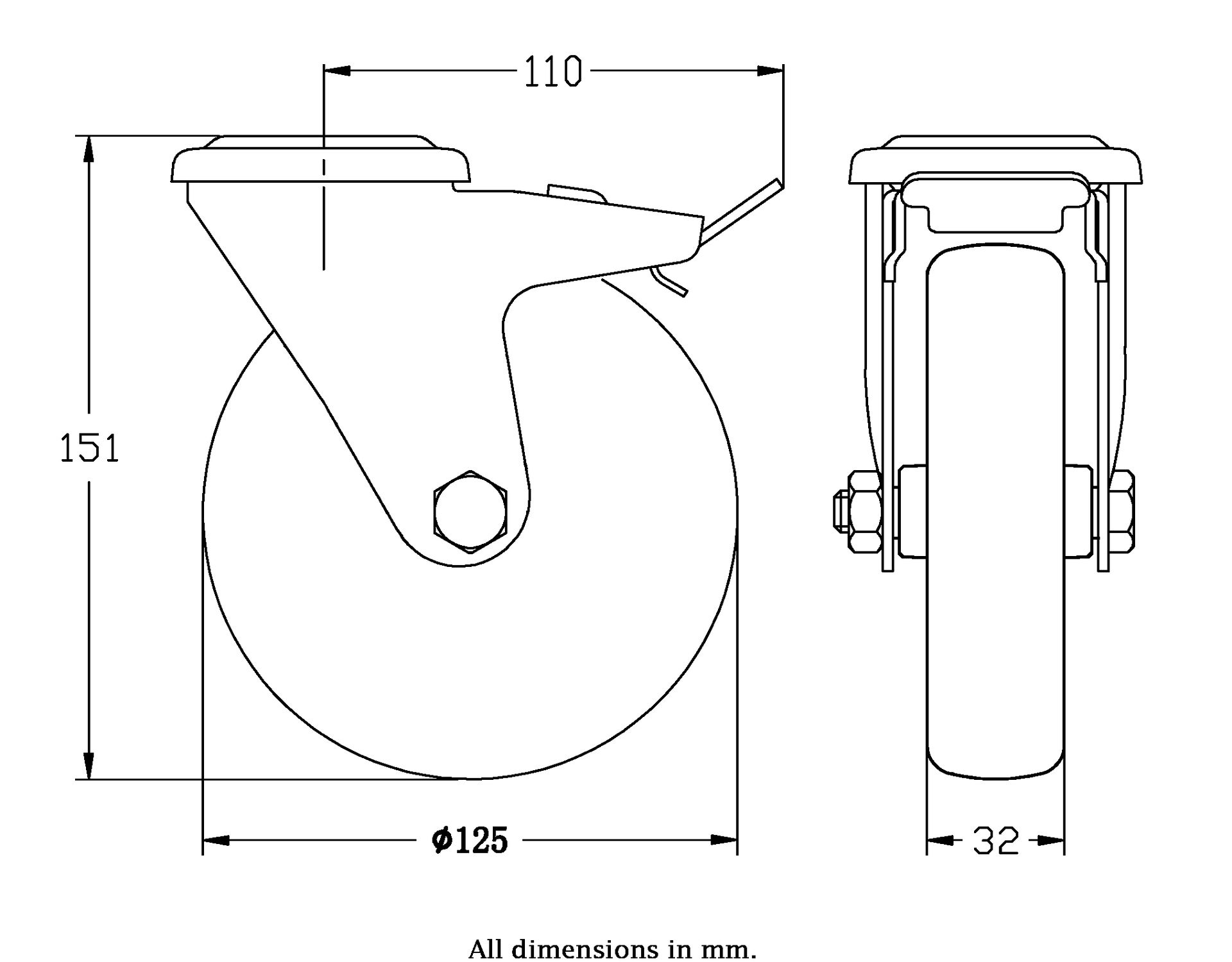 Swivel/brake castor with bolt hole bracket made of zinc plated steel with double row ball race in swivel head.