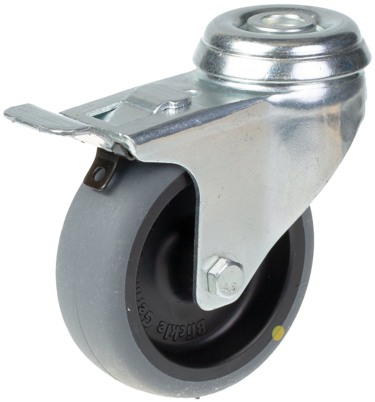 Swivel/brake castor with bolt hole bracket made of zinc plated steel with double row ball race in swivel head.