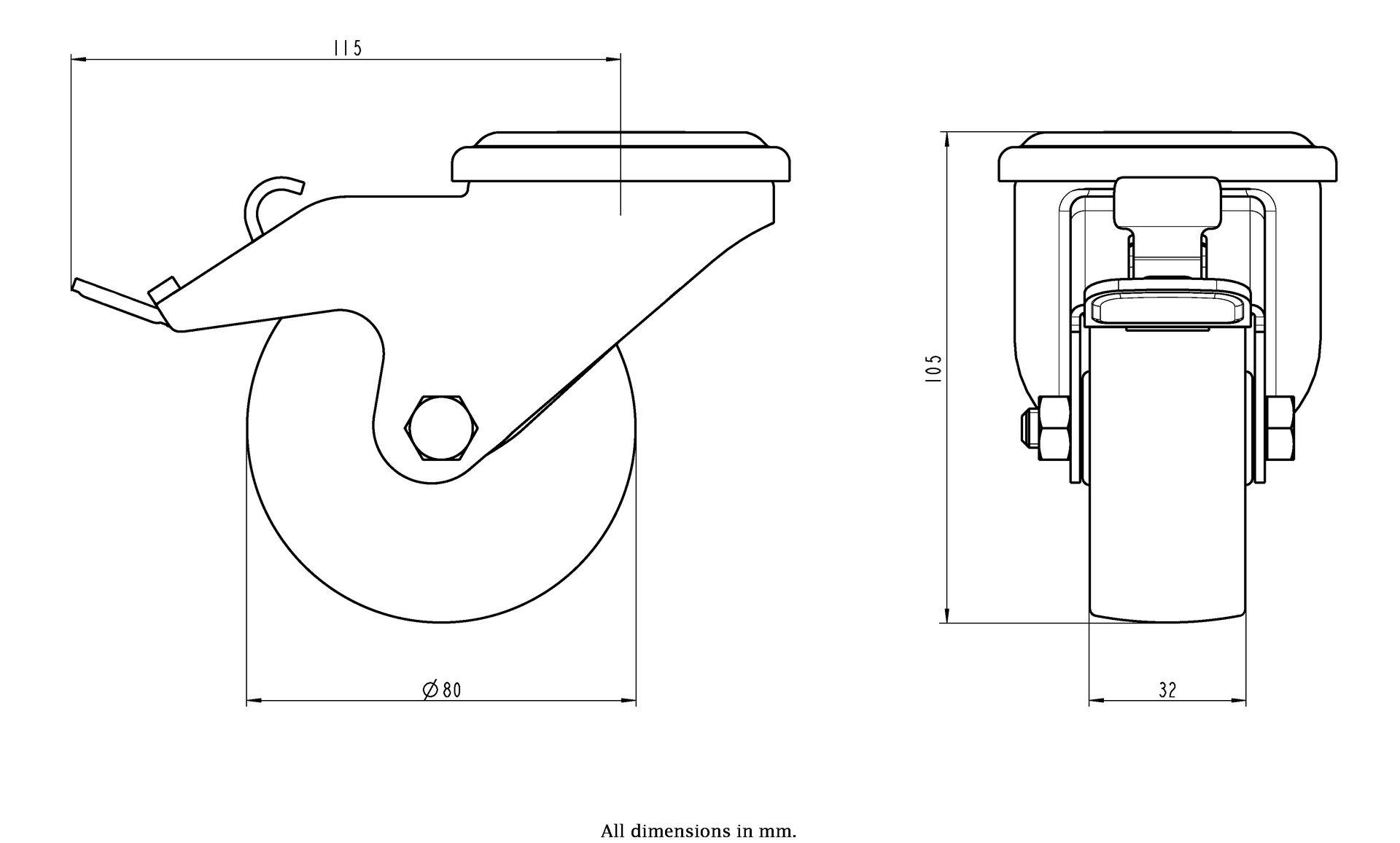 - Foot operated brake that locks both swivel and wheel simultaneously.
