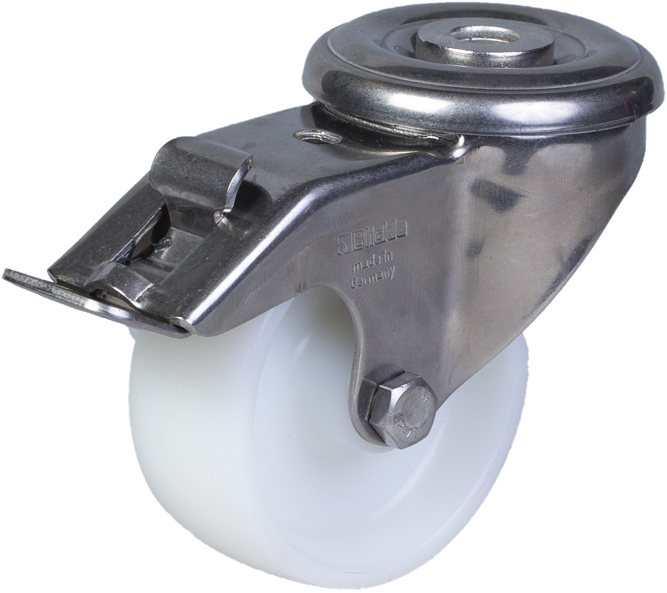 - Swivel/brake castor with bolt hole bracket made of stainless steel with double row ball race in swivel head (material no. 1.4301/AISI 304).