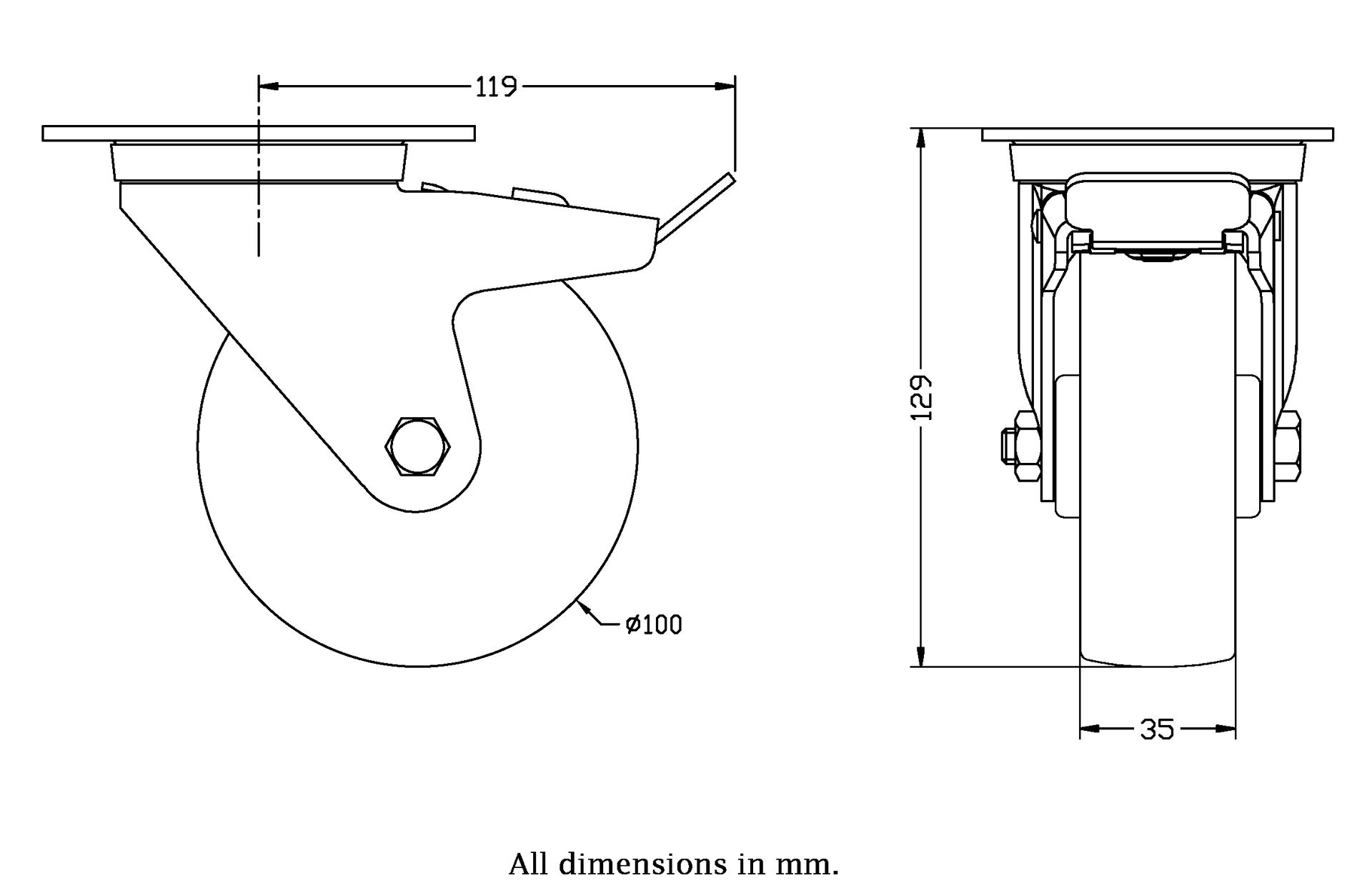 - Swivel/brake castor with top plate bracket made of zinc plated steel with double row ball race in swivel head and dust protection ring.