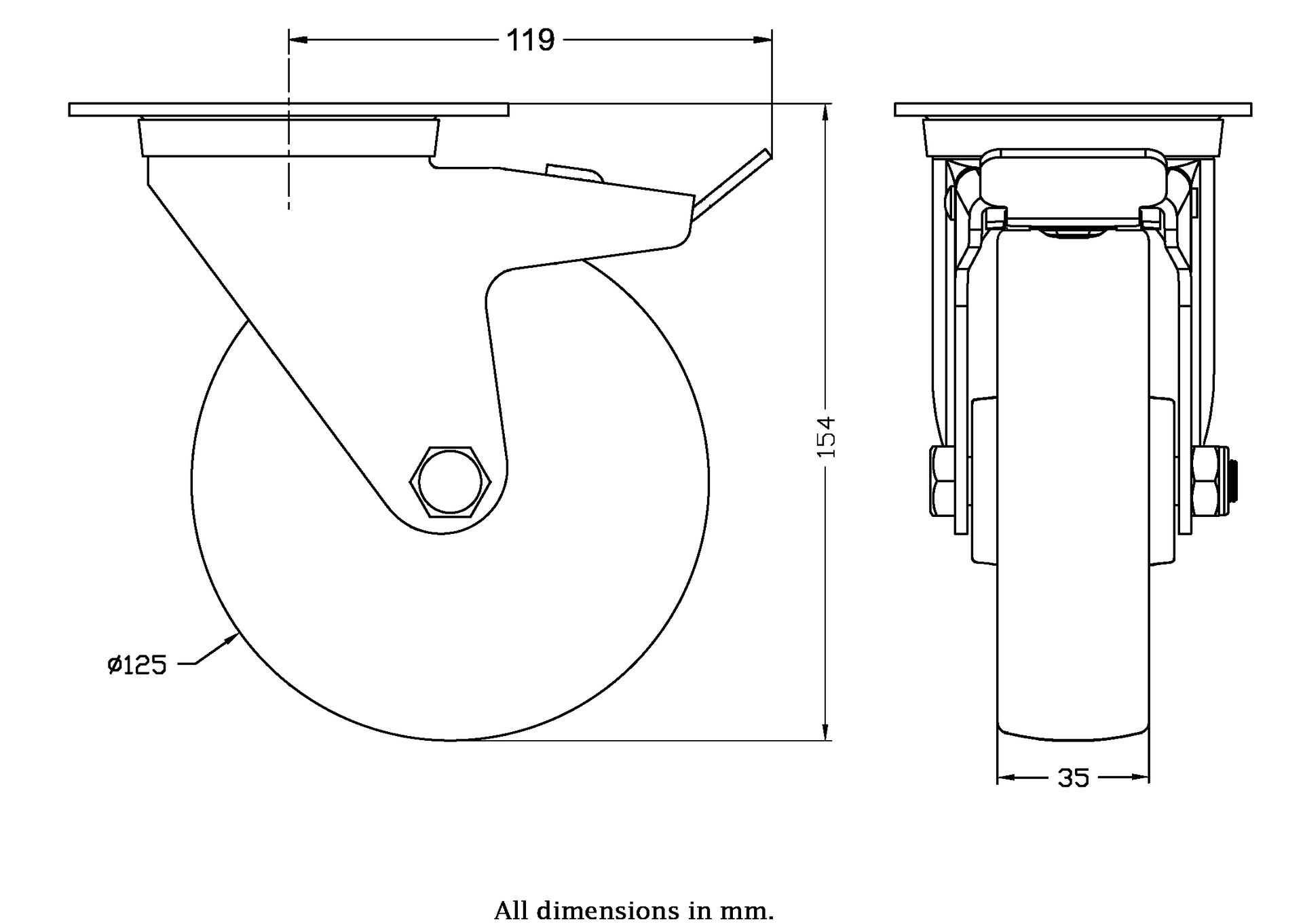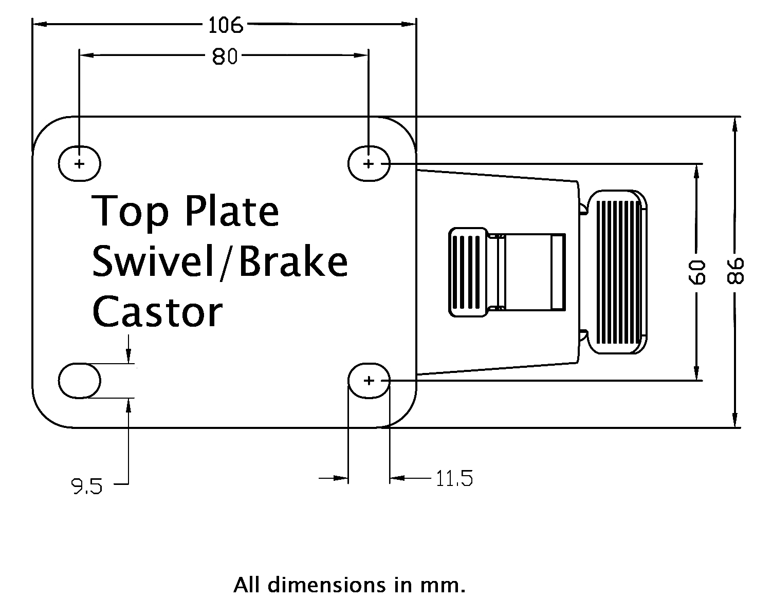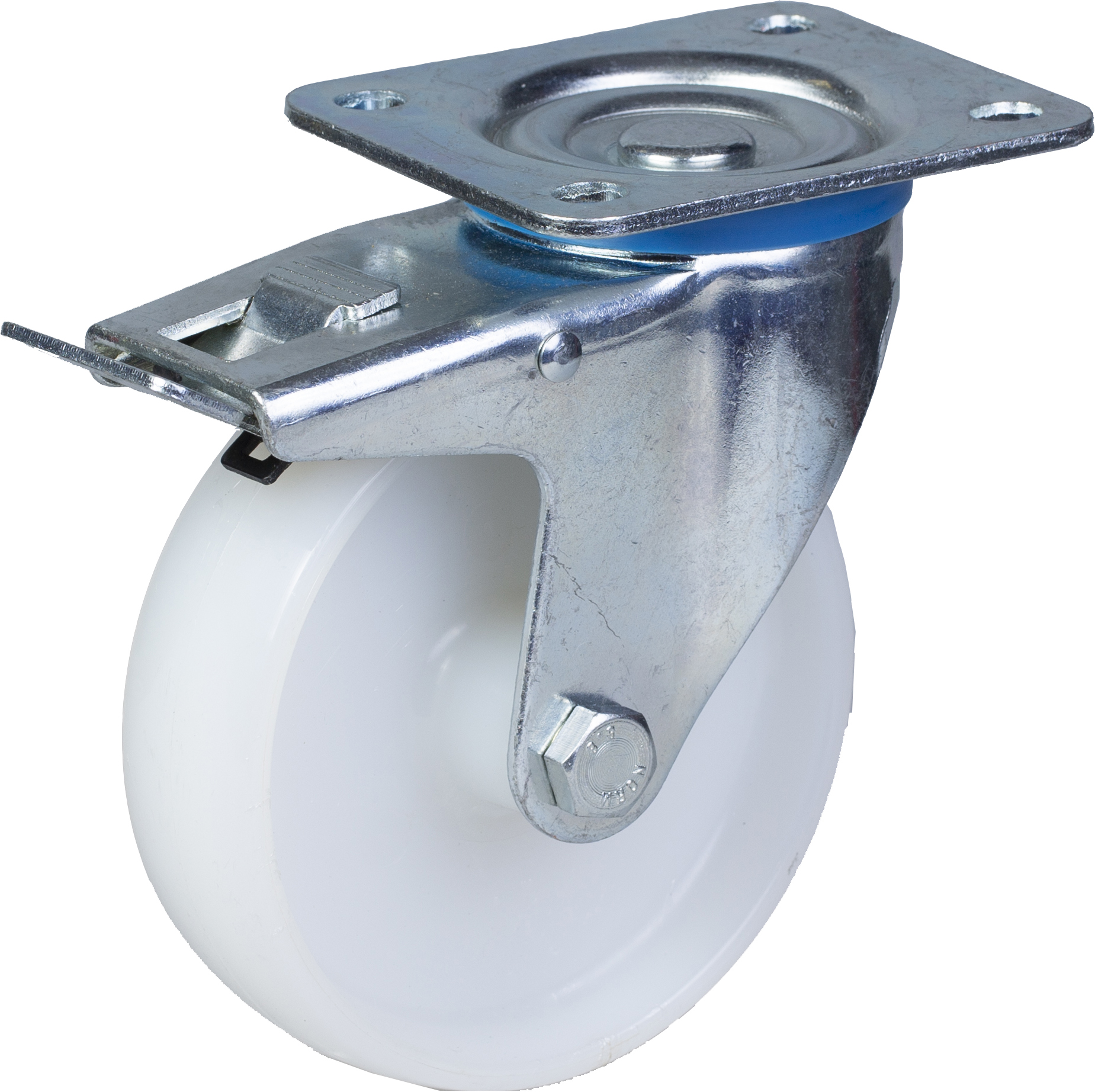 - Swivel/brake castor with top plate bracket made of zinc plated steel with double row ball race in swivel head and dust protection ring.