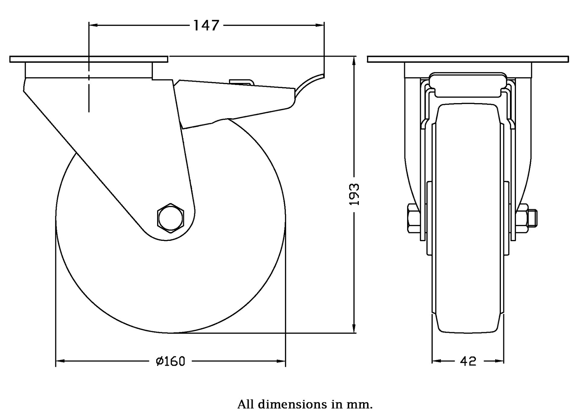 - Swivel/brake castor with top plate bracket made of zinc plated steel with double row ball race in swivel head and dust protection ring.