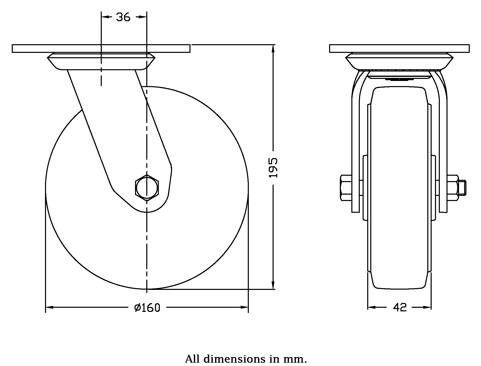 - Swivel castor with strong top plate bracket made of zinc plated steel with double row ball race in swivel head.