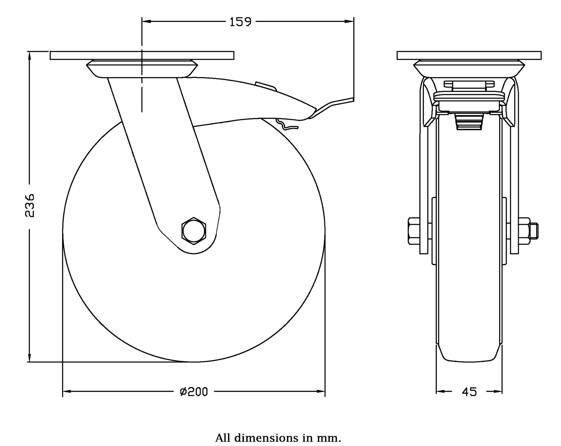 - Swivel/brake castor with strong top plate bracket made of zinc plated steel with double row ball race in swivel head.
