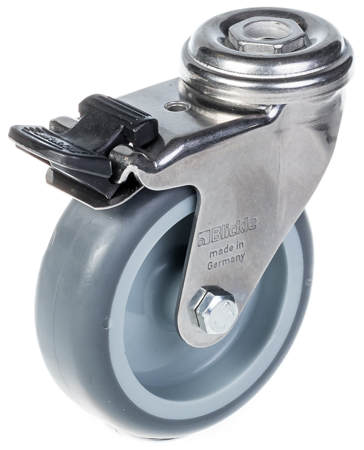 75mm stainless steel swivel/brake castor with grey thermoplastic rubber on polypropylene centre wheel