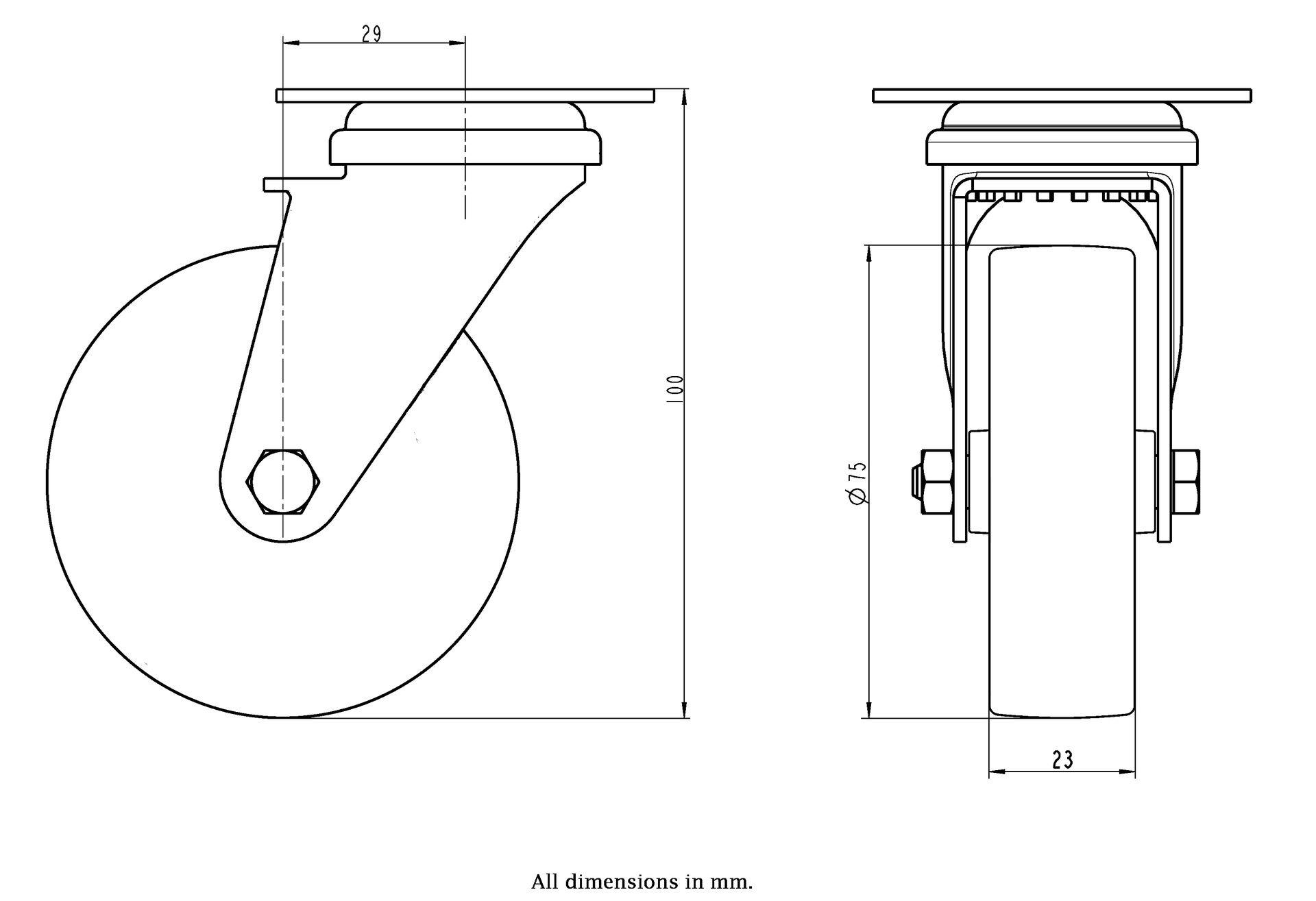 Swivel castor with top plate bracket made of stainless steel with double row ball race in swivel head (material no. 1.4301/AISI 304).