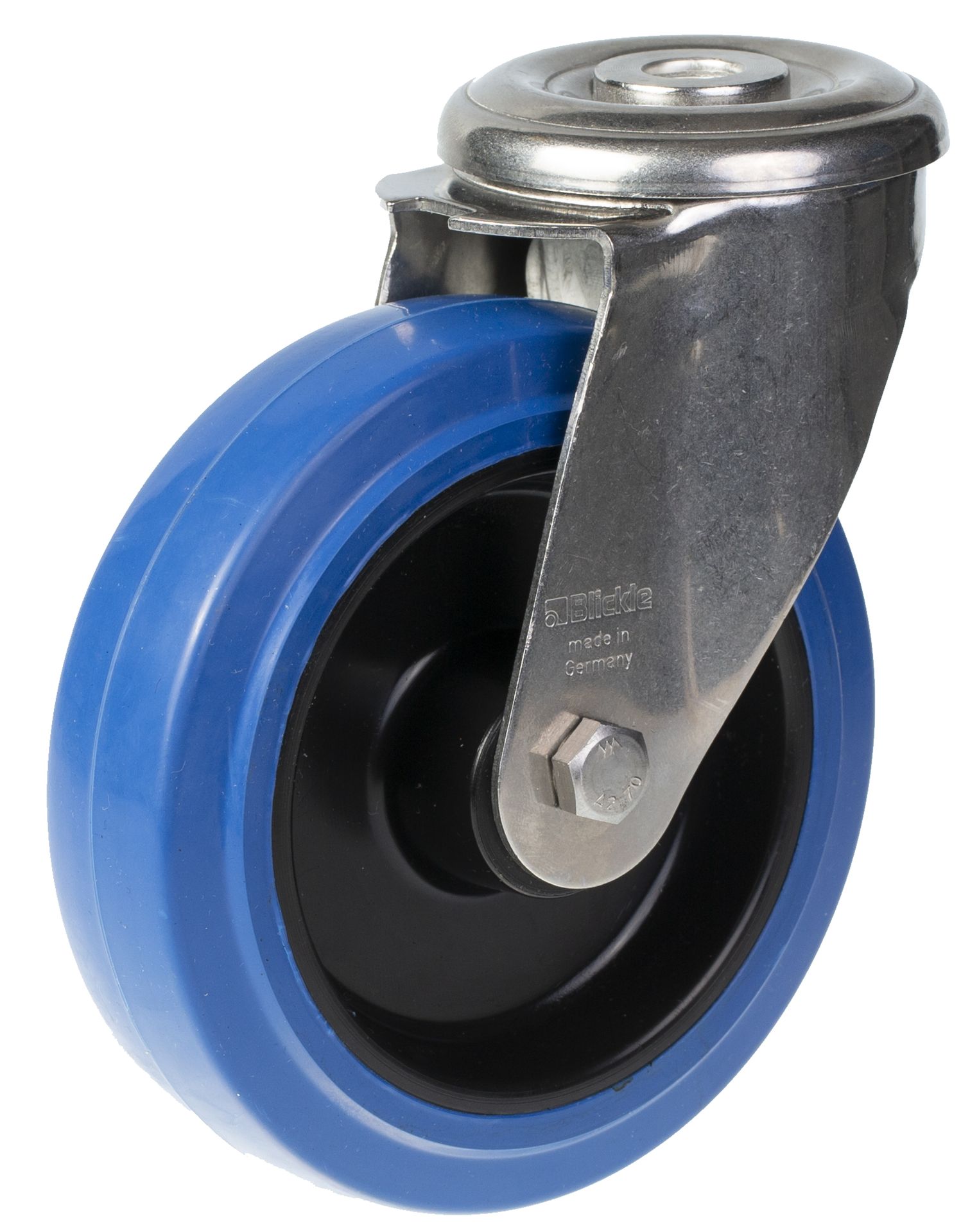 Swivel castor with bolt hole bracket made of stainless steel with double row ball race in swivel head (material no. 1.4301/AISI 304).