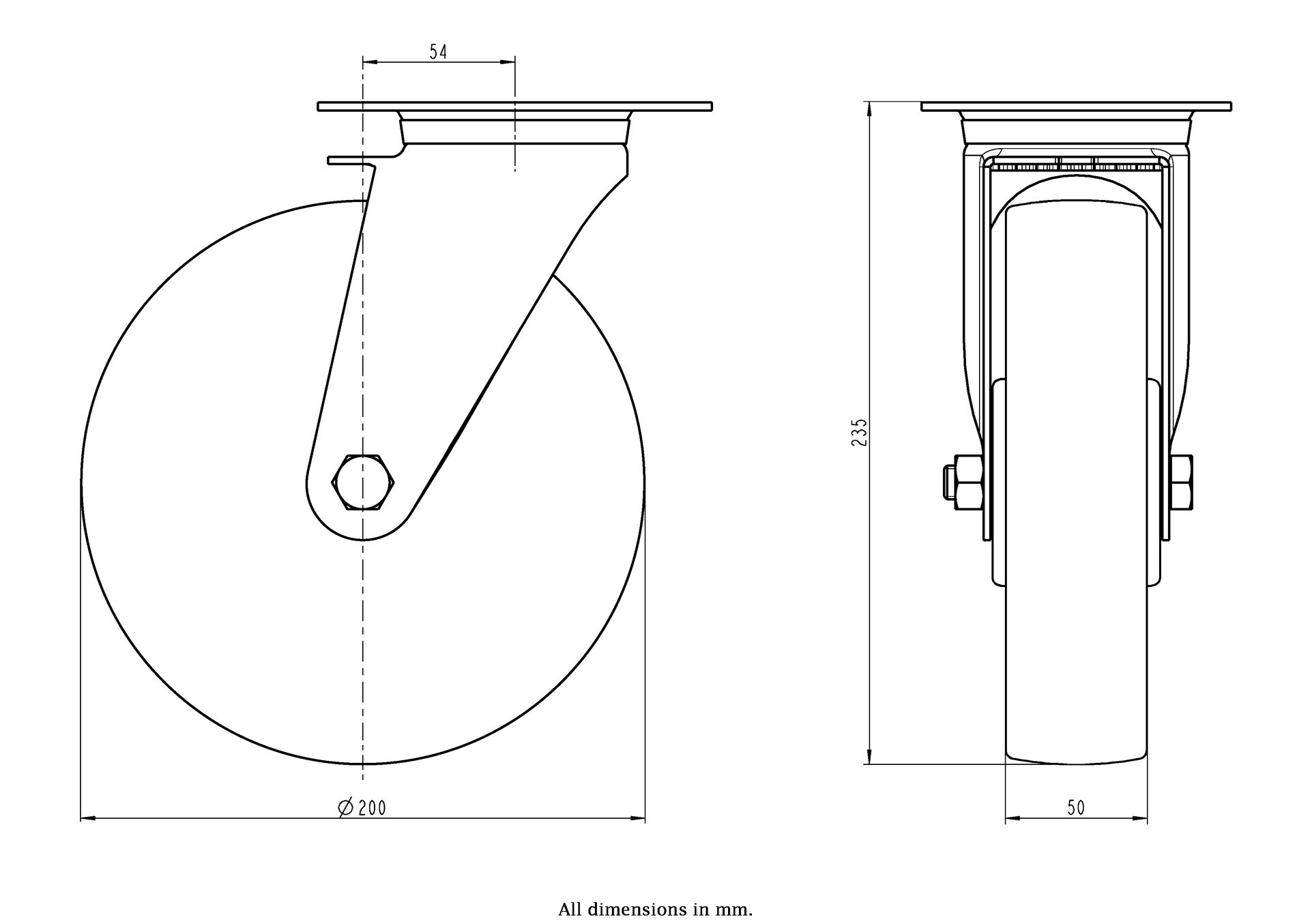 200mm stainless steel swivel castor with grey thermoplastic polyurethane on polypropylene centre wheel