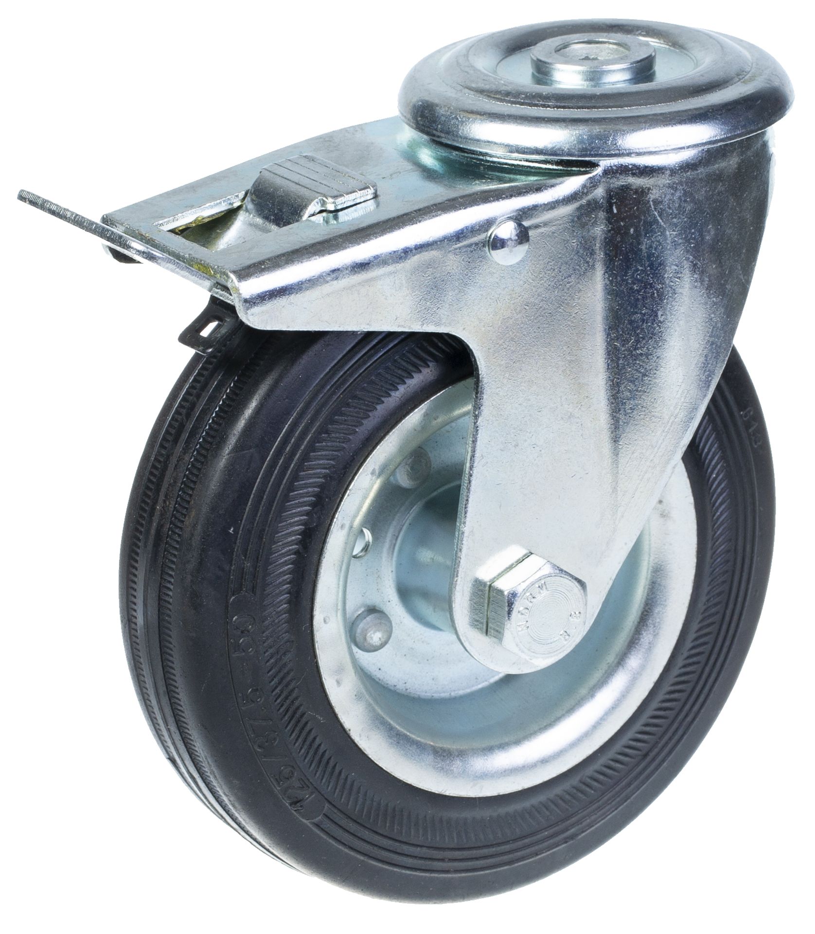 125mm swivel/brake castor with black rubber on pressed steel centre wheel