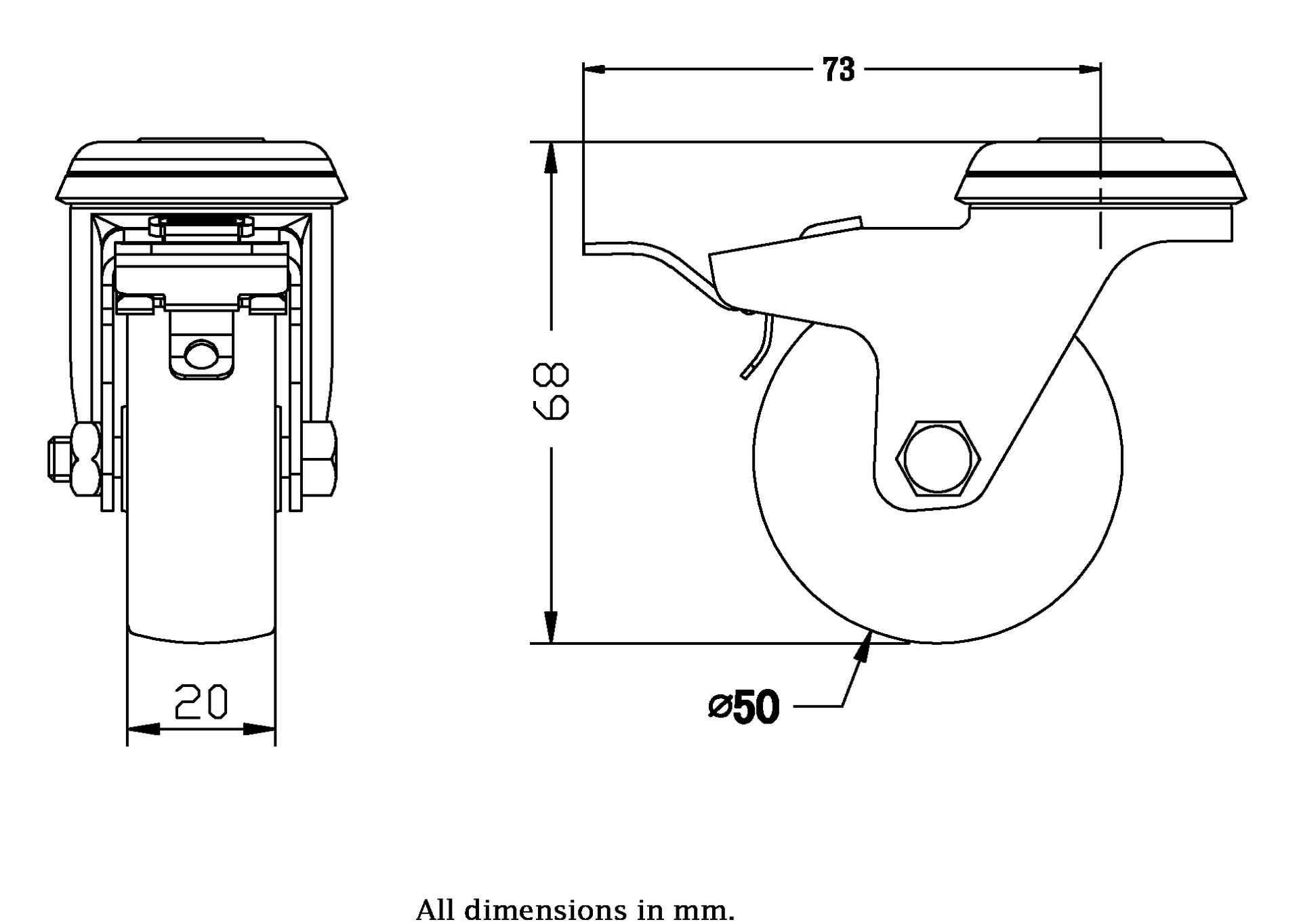 Swivel/brake castor with bolt hole bracket made of zinc plated steel with double row ball race in swivel head.