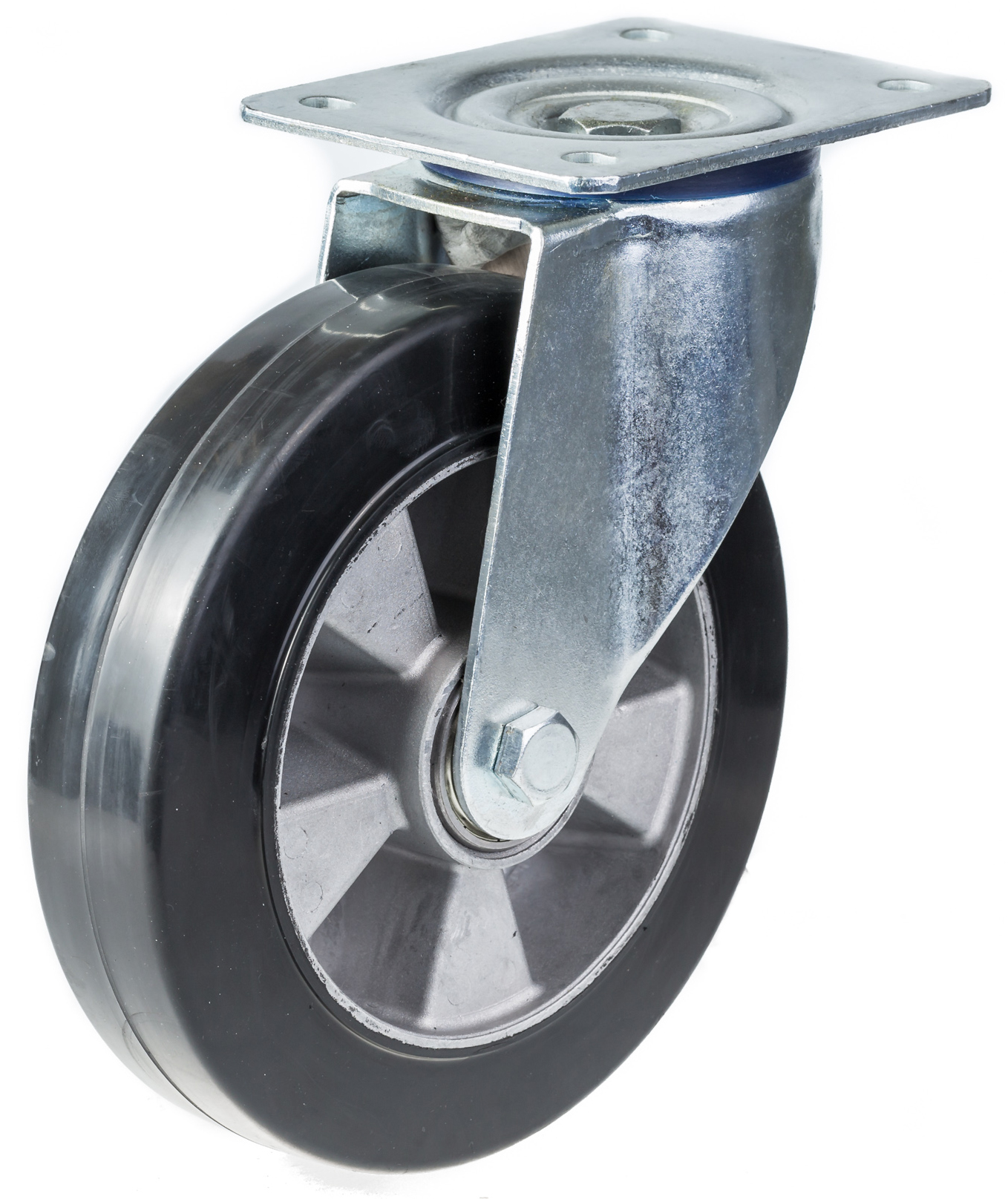 - Swivel castor with top plate bracket made of zinc plated steel with double row ball race in swivel head and dust protection ring.