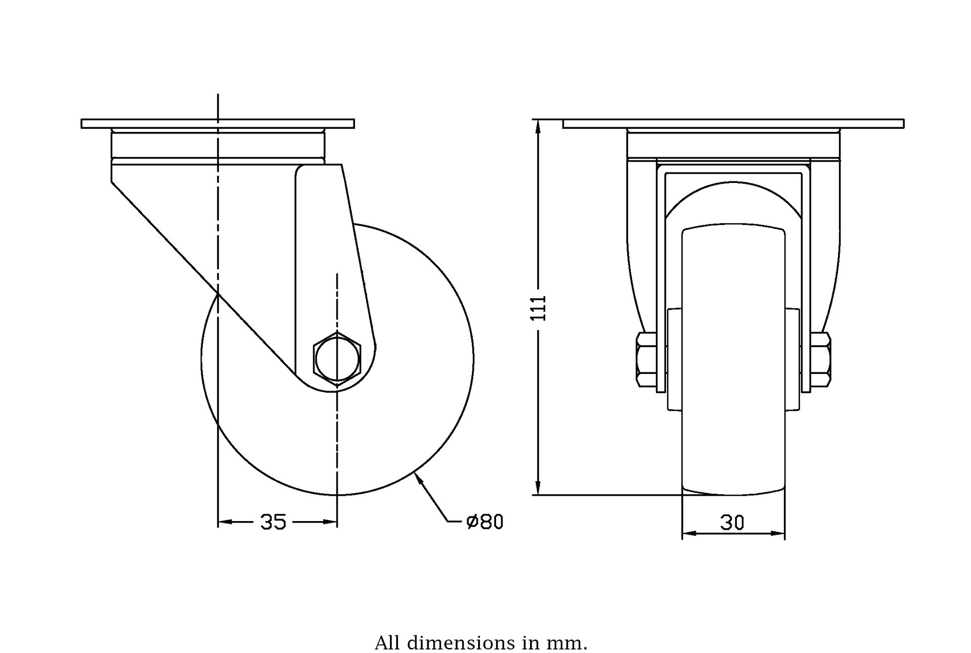 Swivel castor with top plate bracket made of zinc plated steel with double row ball race in swivel head and dust protection ring.