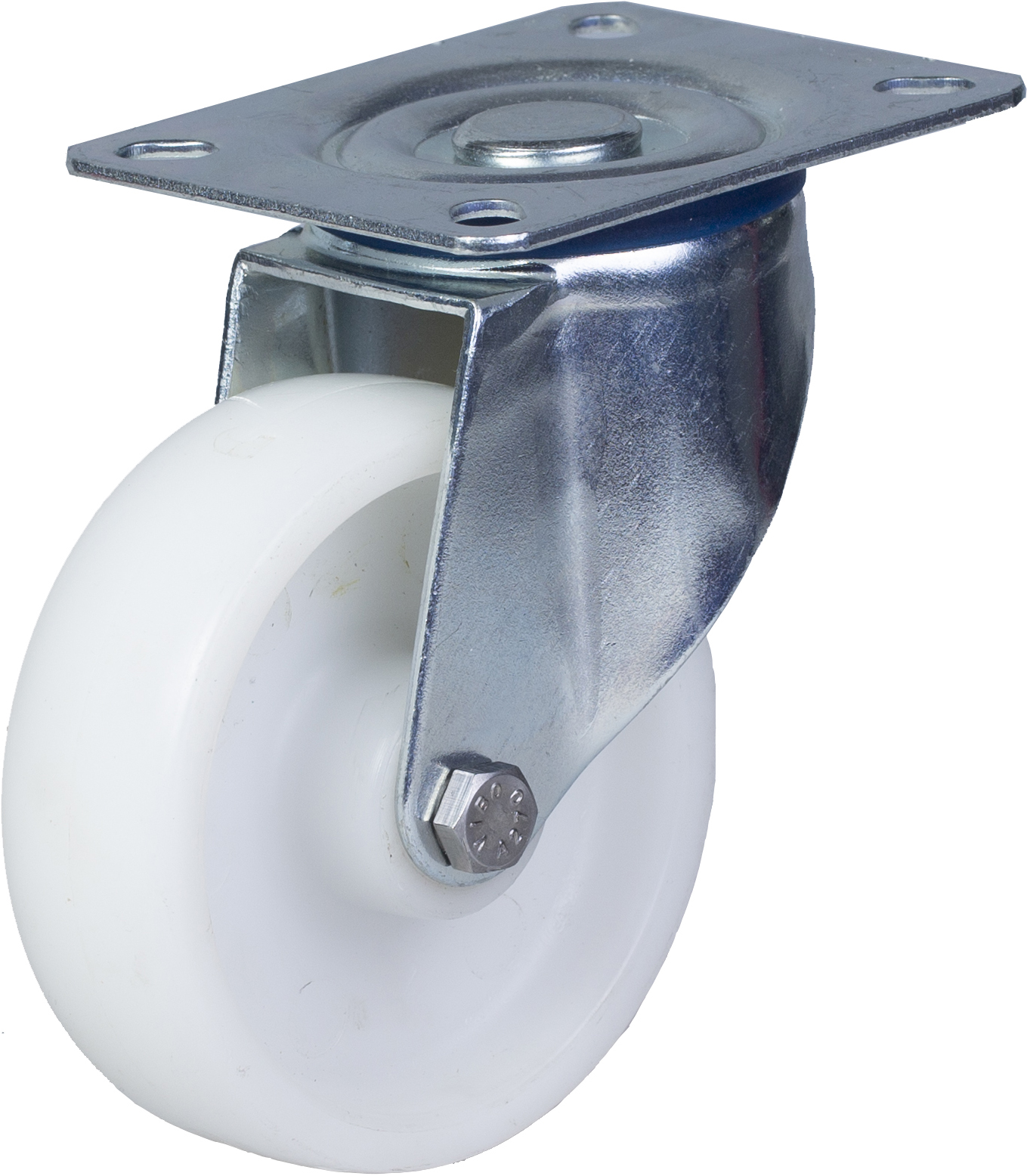 - Swivel castor with top plate bracket made of zinc plated steel with double row ball race in swivel head and dust protection ring.