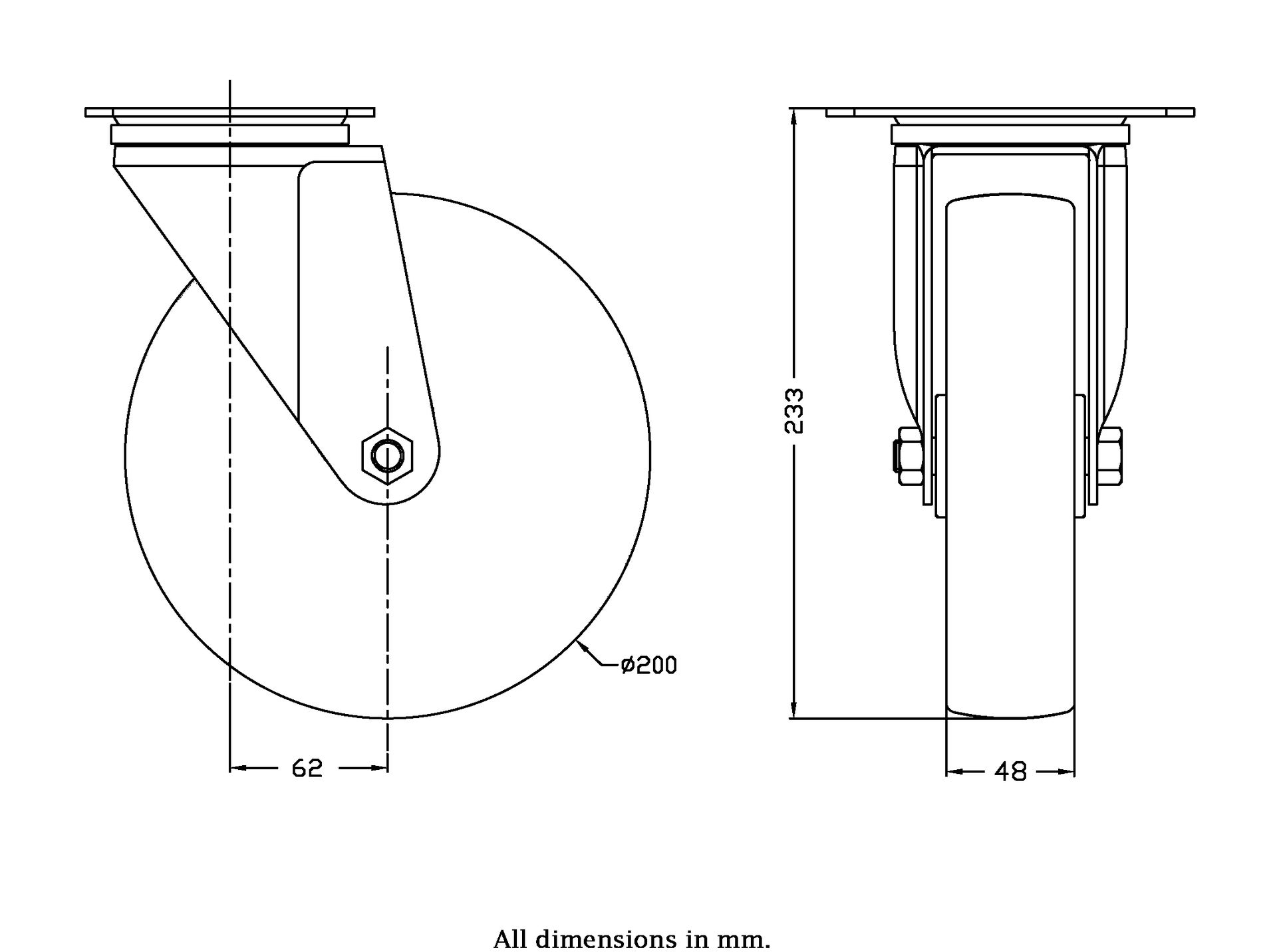 Swivel castor with top plate bracket made of zinc plated steel with double row ball race in swivel head and dust protection ring.
