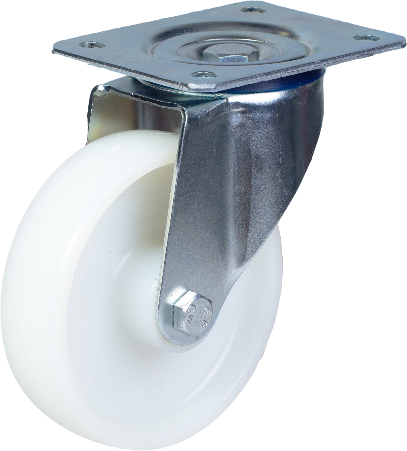 Swivel castor with top plate bracket made of zinc plated steel with double row ball race in swivel head and dust protection ring.