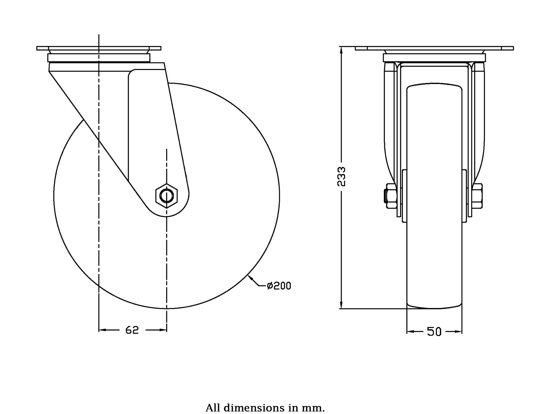 Swivel castor with top plate bracket made of zinc plated steel with double row ball race in swivel head and dust protection ring.