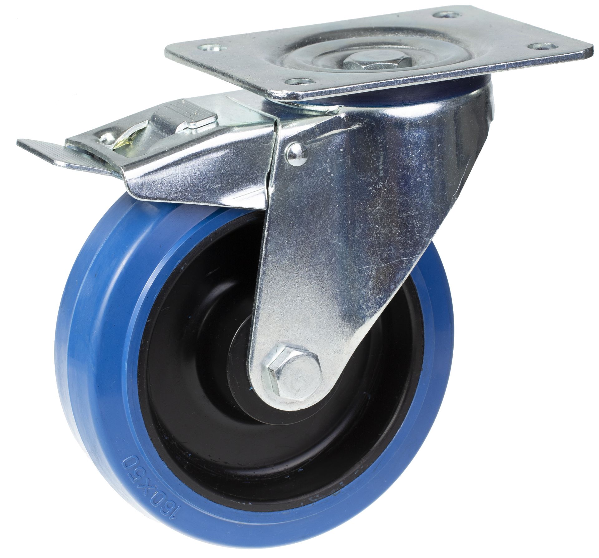 160mm swivel/brake castor with blue elastic rubber on nylon centre wheel