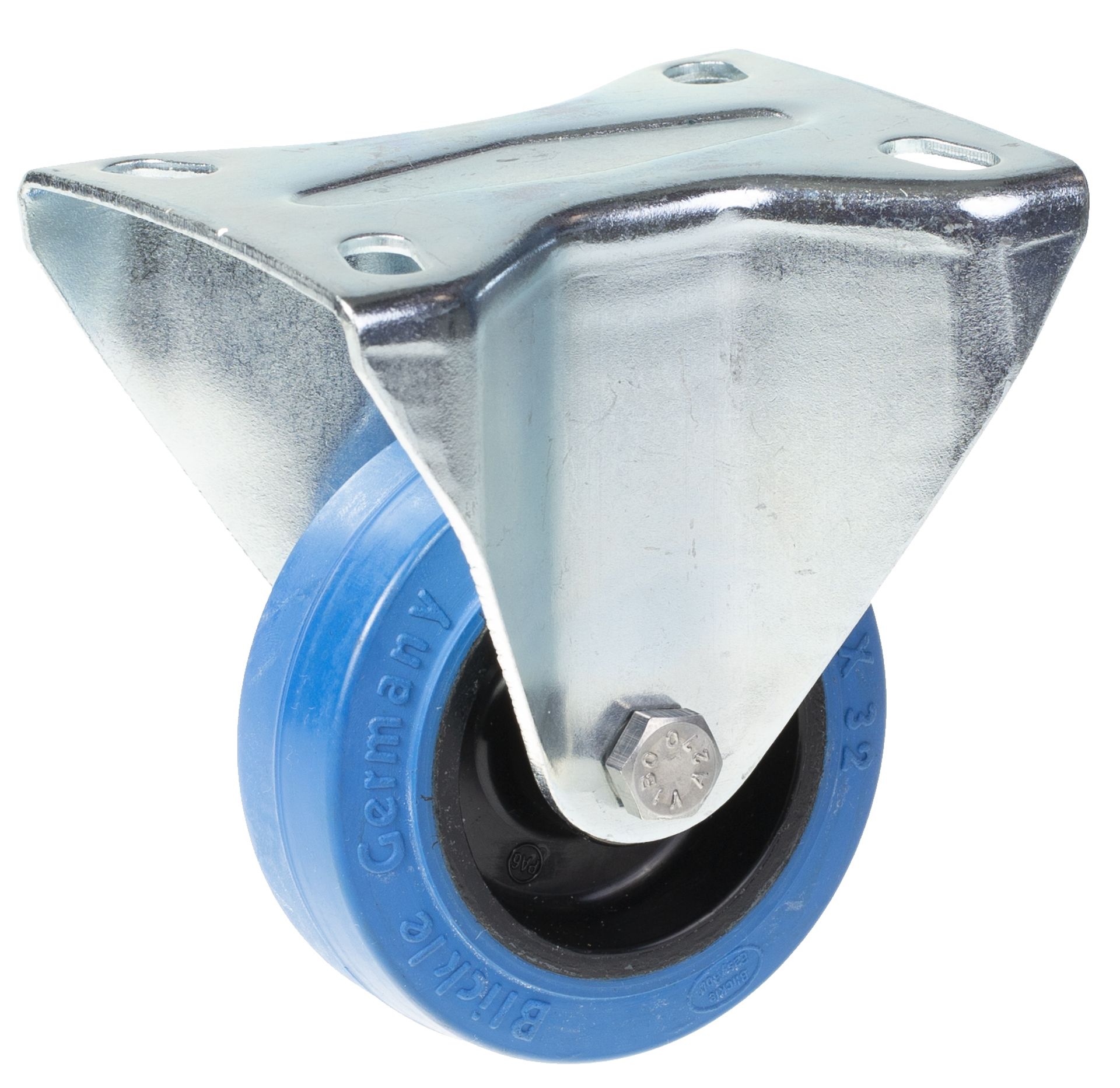 - Fixed castor with top plate bracket made of zinc plated steel.