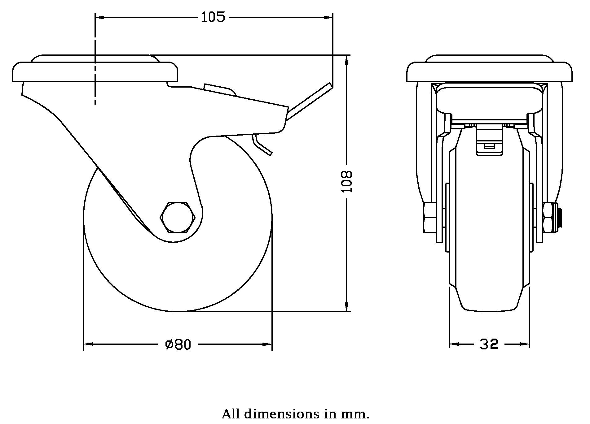 - Swivel/brake castor with bolt hole bracket made of zinc plated steel with double row ball race in swivel head.
