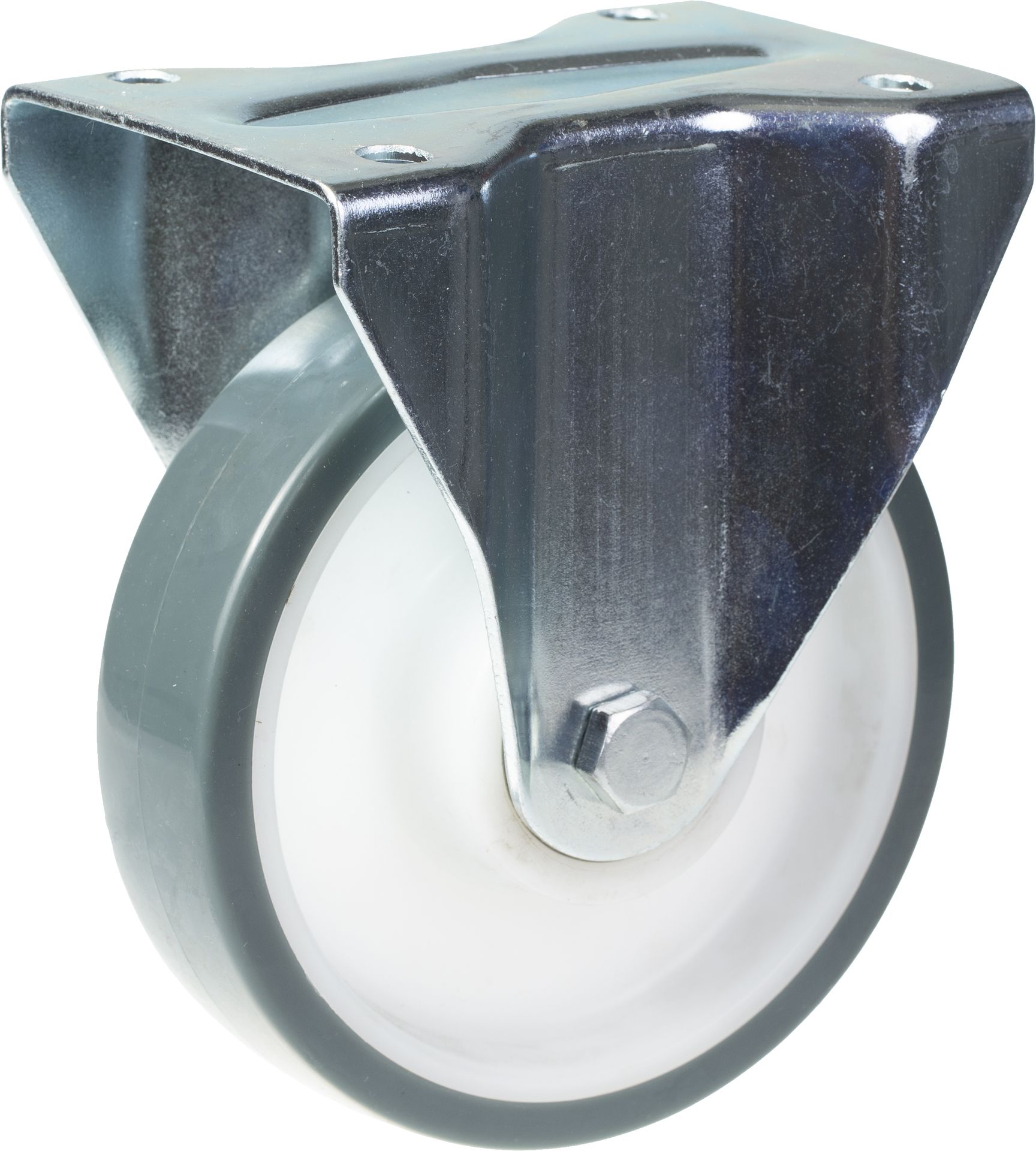 - Fixed castor with top plate bracket made of zinc plated steel.