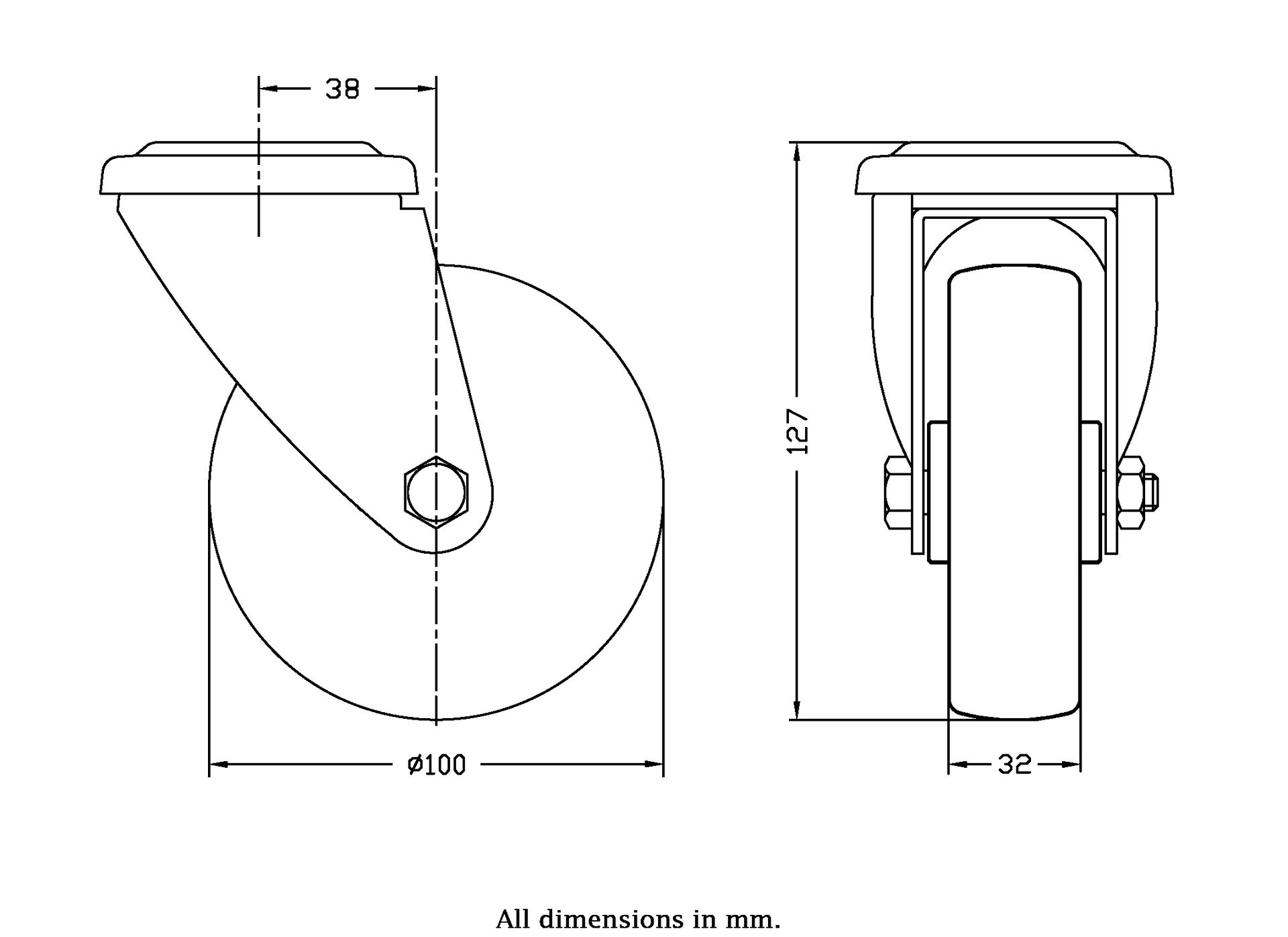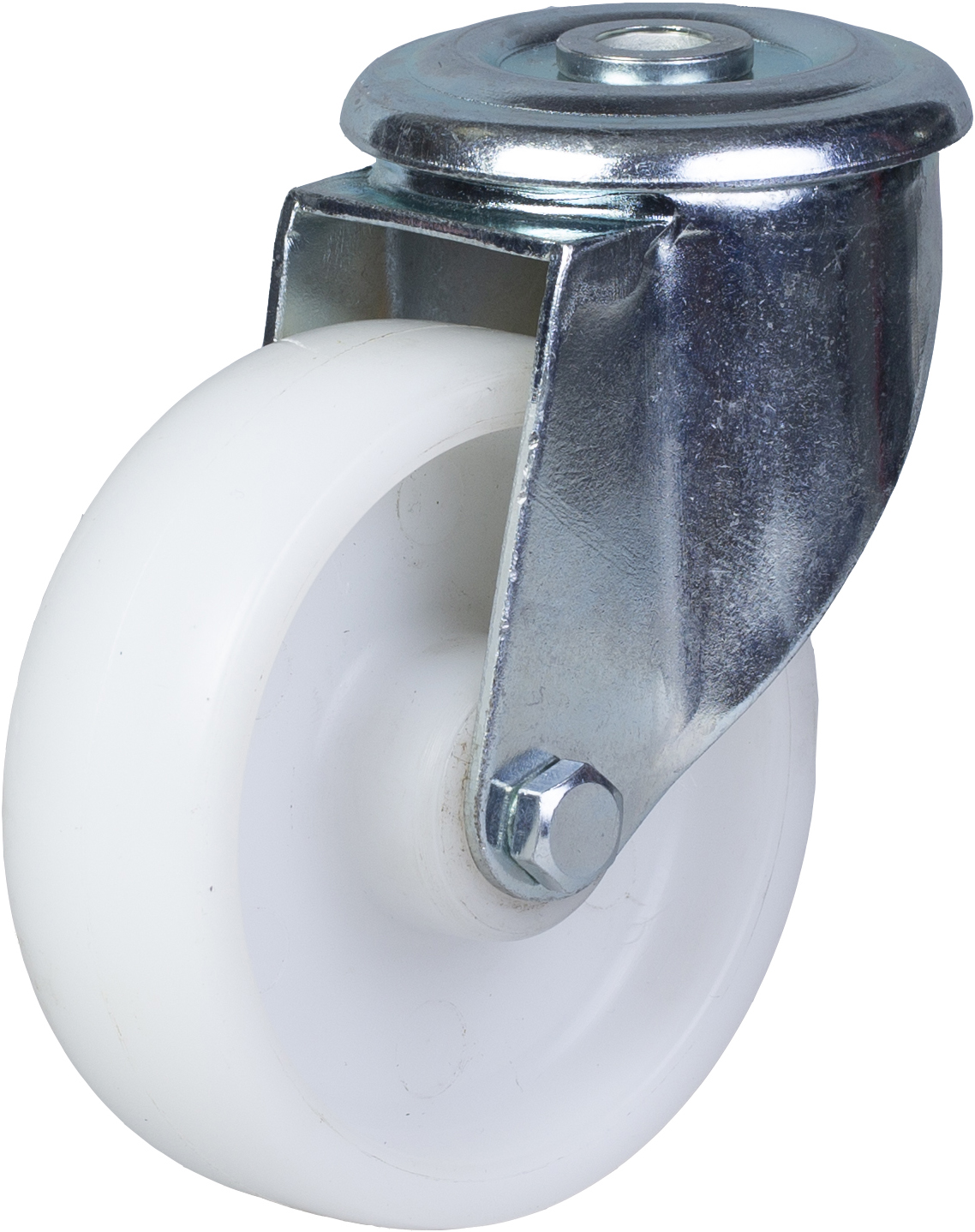 Swivel castor with bolt hole bracket made of zinc plated steel with double row ball race in swivel head.