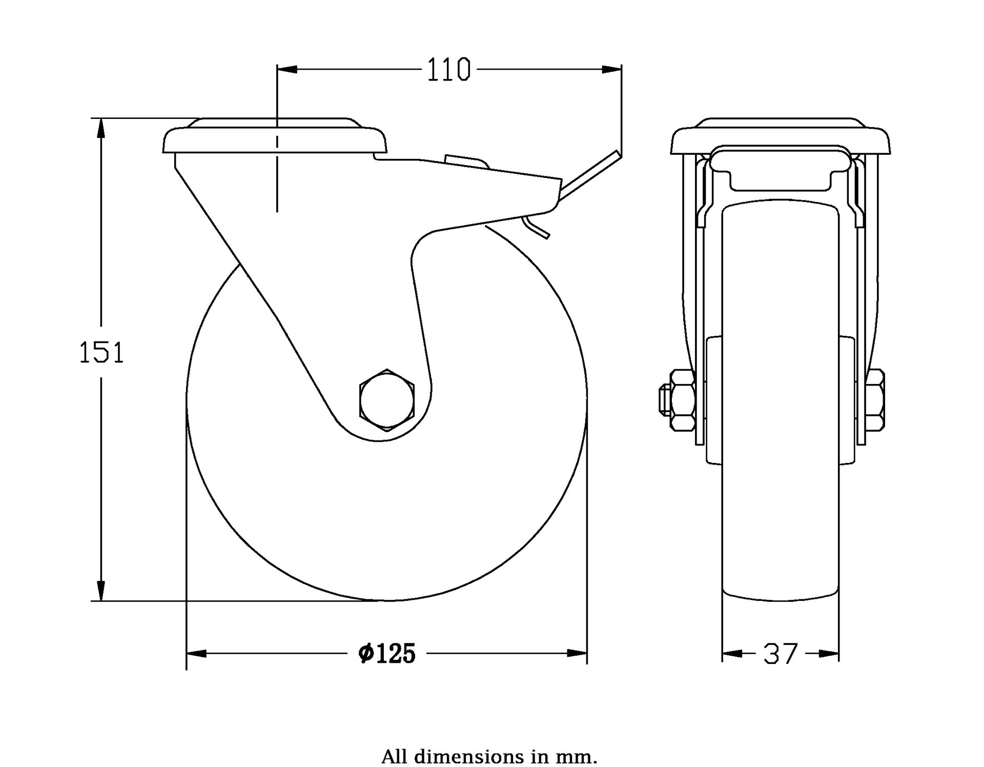 Swivel/brake castor with bolt hole bracket made of zinc plated steel with double row ball race in swivel head.