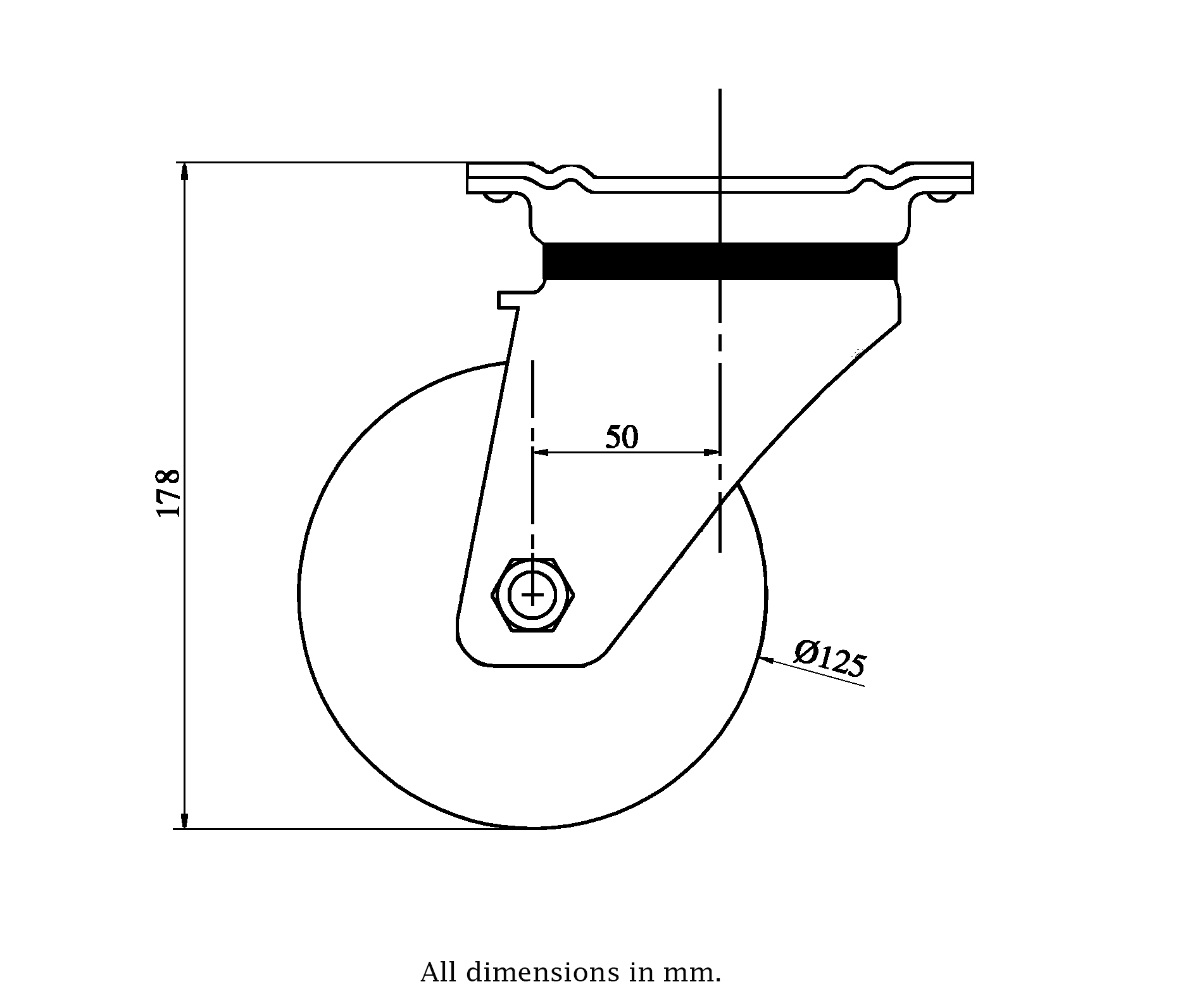 - Swivel castor with strong top plate bracket made of zinc plated steel with sealed hardened double row ball race in swivel head, grease nipple and dust protection ring.