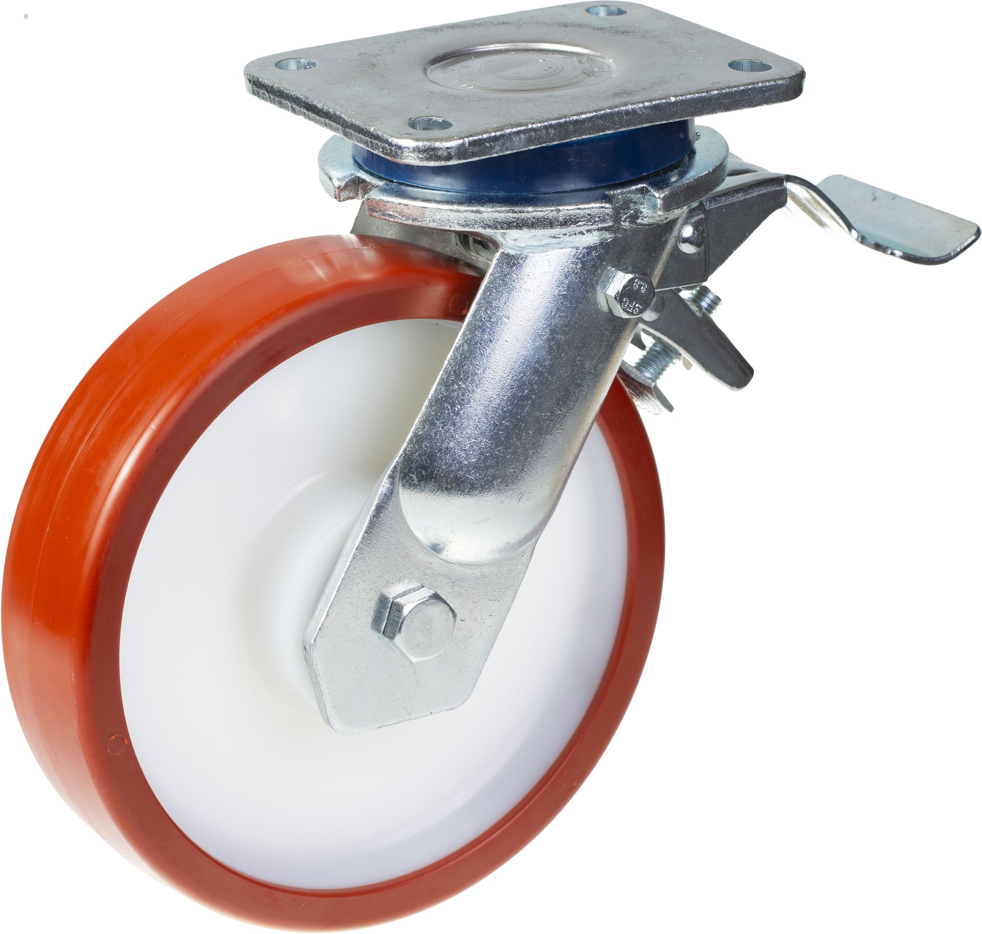 - Swivel/brake castor with very strong top plate bracket made of zinc plated steel with a combination of thrust ball bearing and taper roller bearing in swivel head, with dust protection ring.