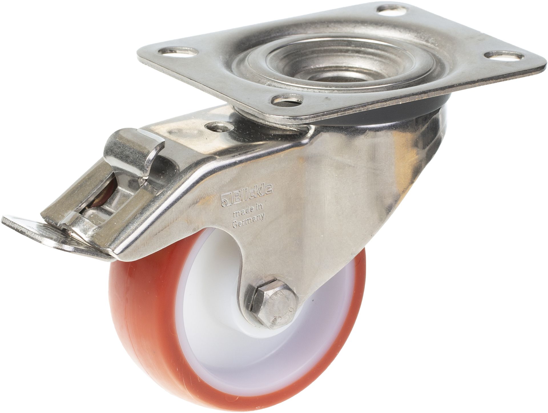 80mm stainless steel swivel/brake castor with red thermoplastic polyurethane on nylon centre wheel