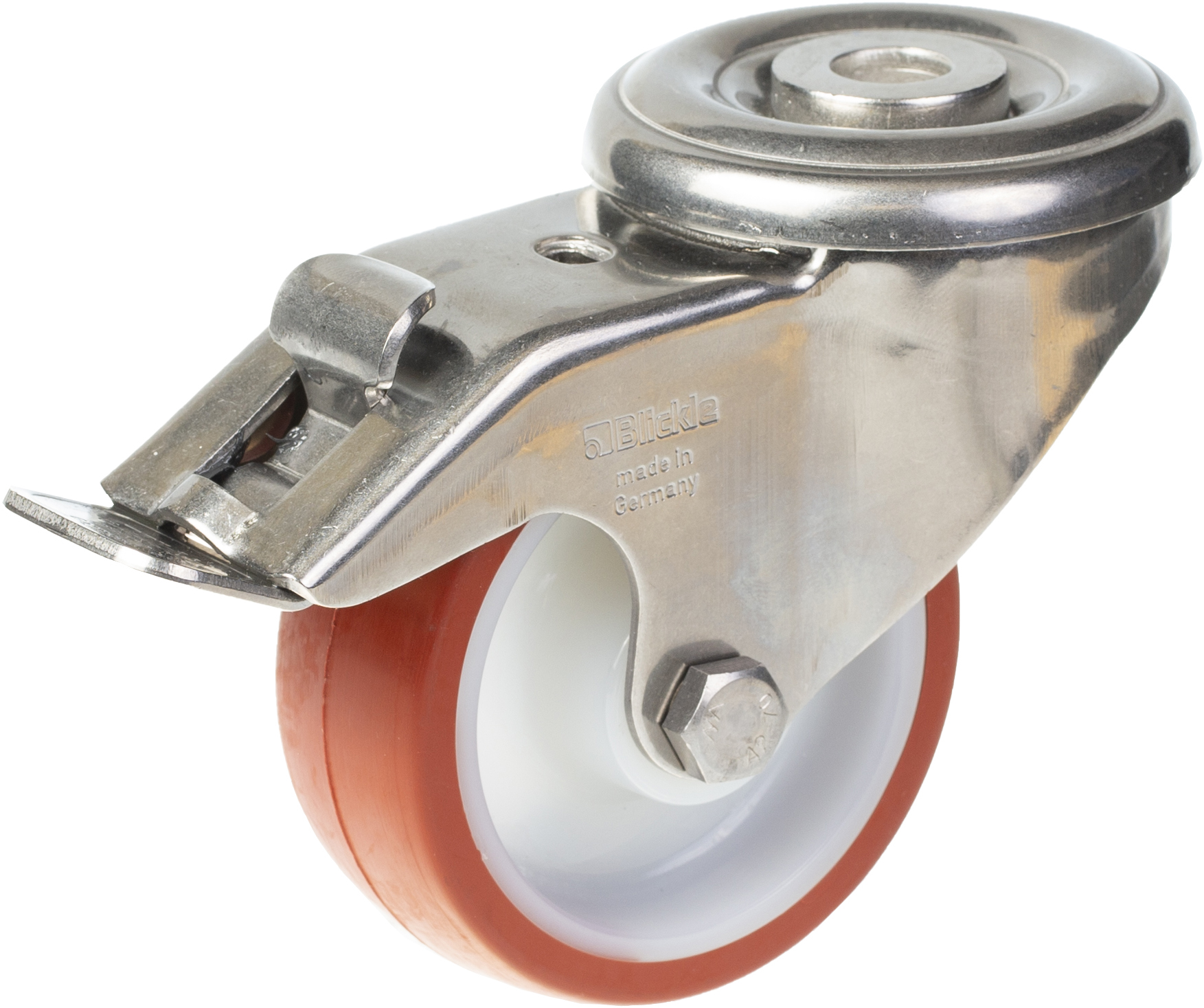 Swivel/brake castor with bolt hole bracket made of stainless steel with double row ball race in swivel head (material no. 1.4301/AISI 304).