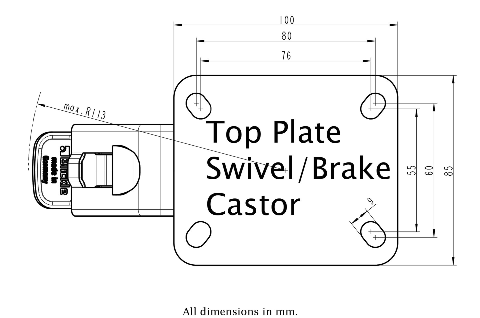 Swivel/brake castor with top plate bracket made of stainless steel with double row ball race in swivel head (material no. 1.4301/AISI 304), with dust protection ring.