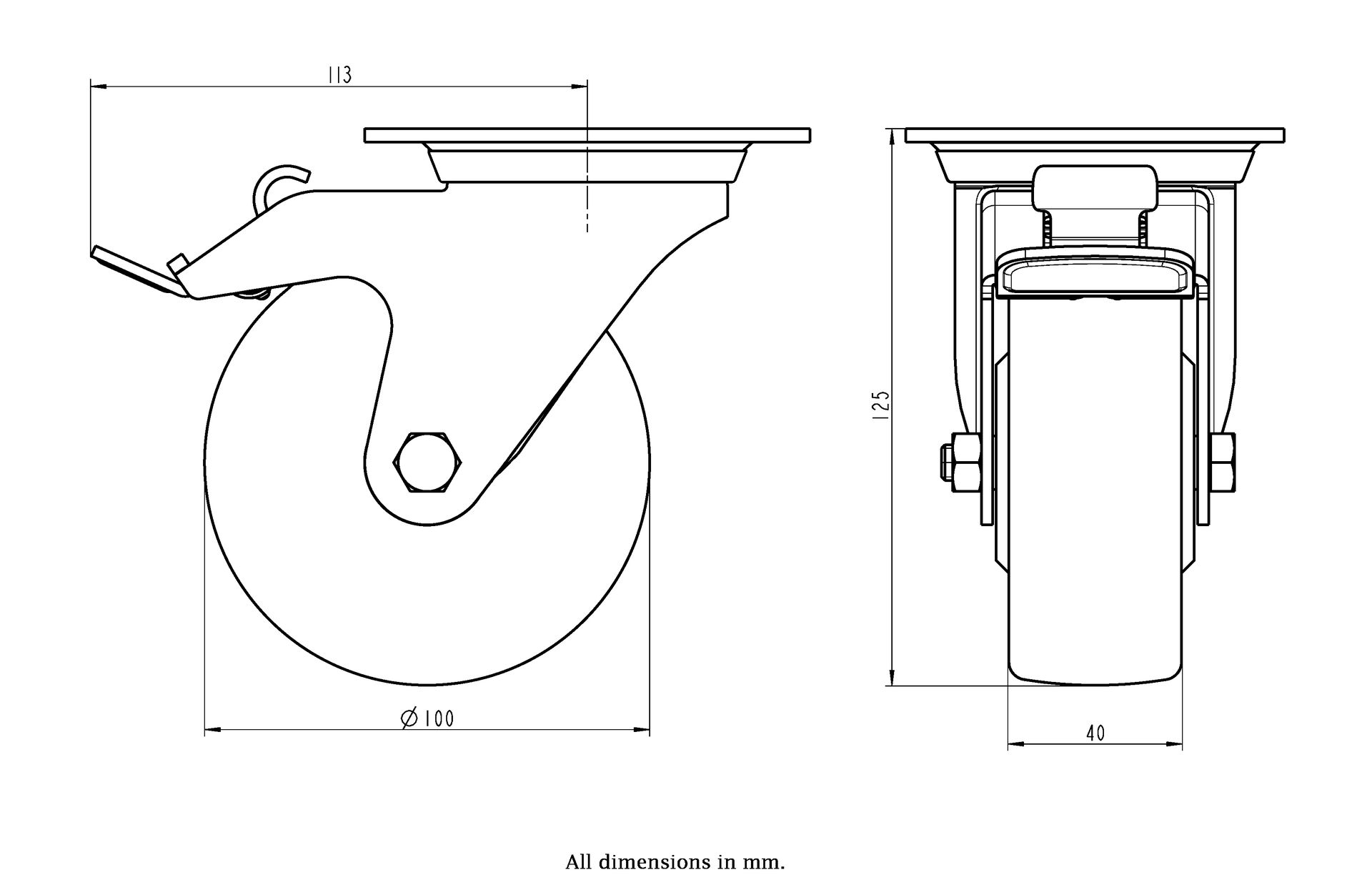 Foot operated brake that locks both swivel and wheel simultaneously.