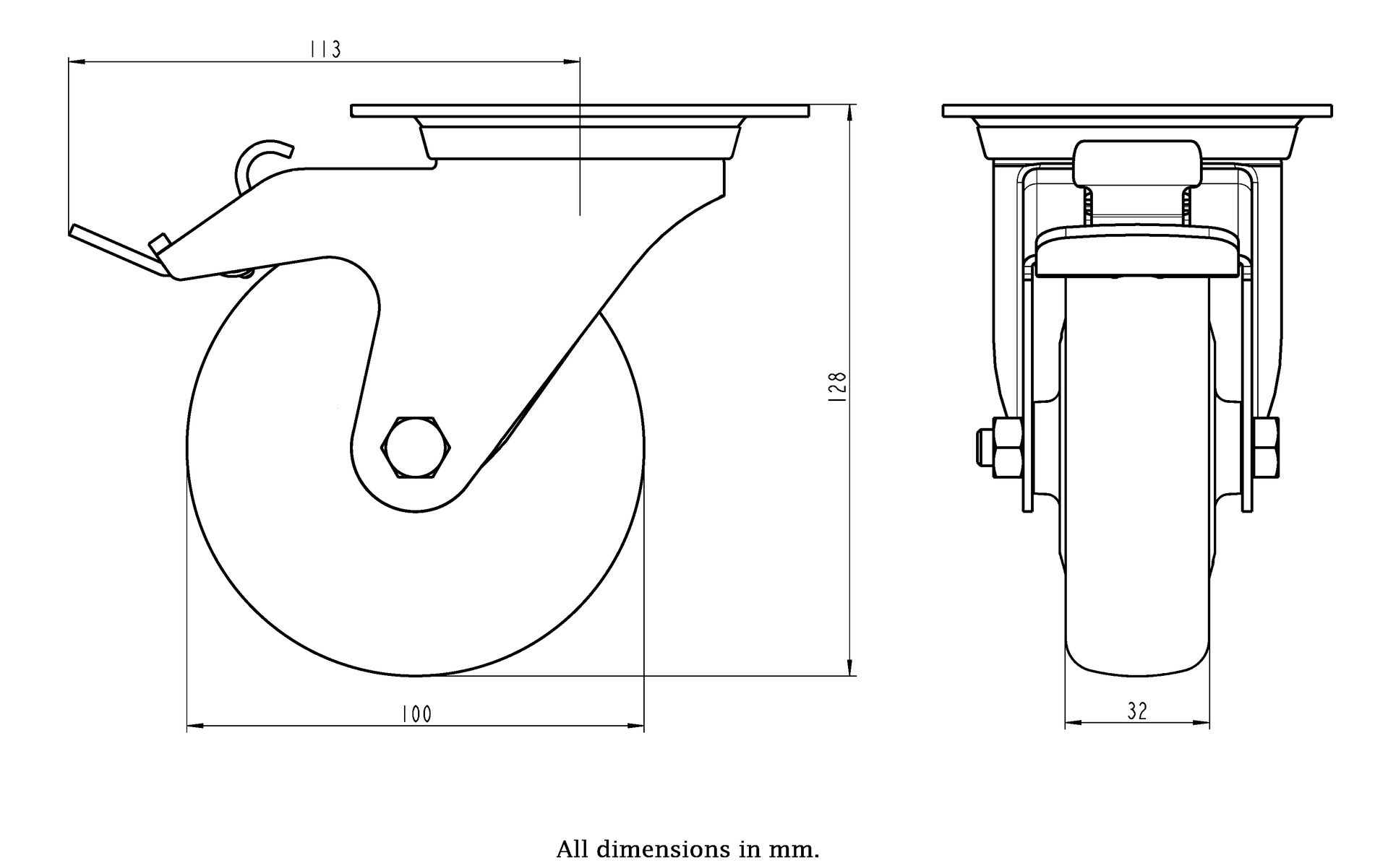 100mm stainless steel swivel/brake castor with grey electrically conductive thermoplastic polyurethane on nylon centre wheel