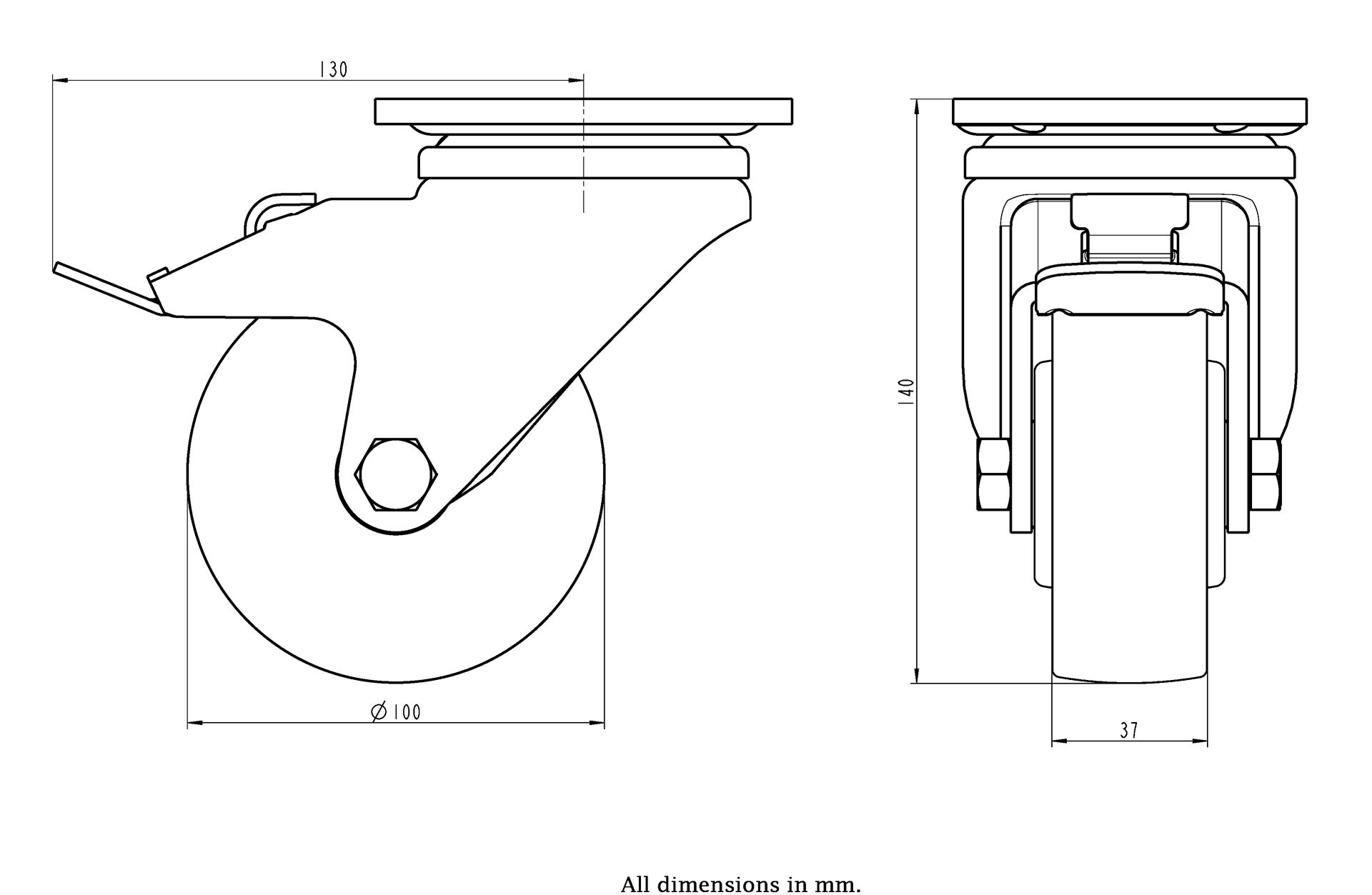 Swivel/brake castor with strong top plate bracket made of zinc plated steel with hardened double row ball race in swivel head.