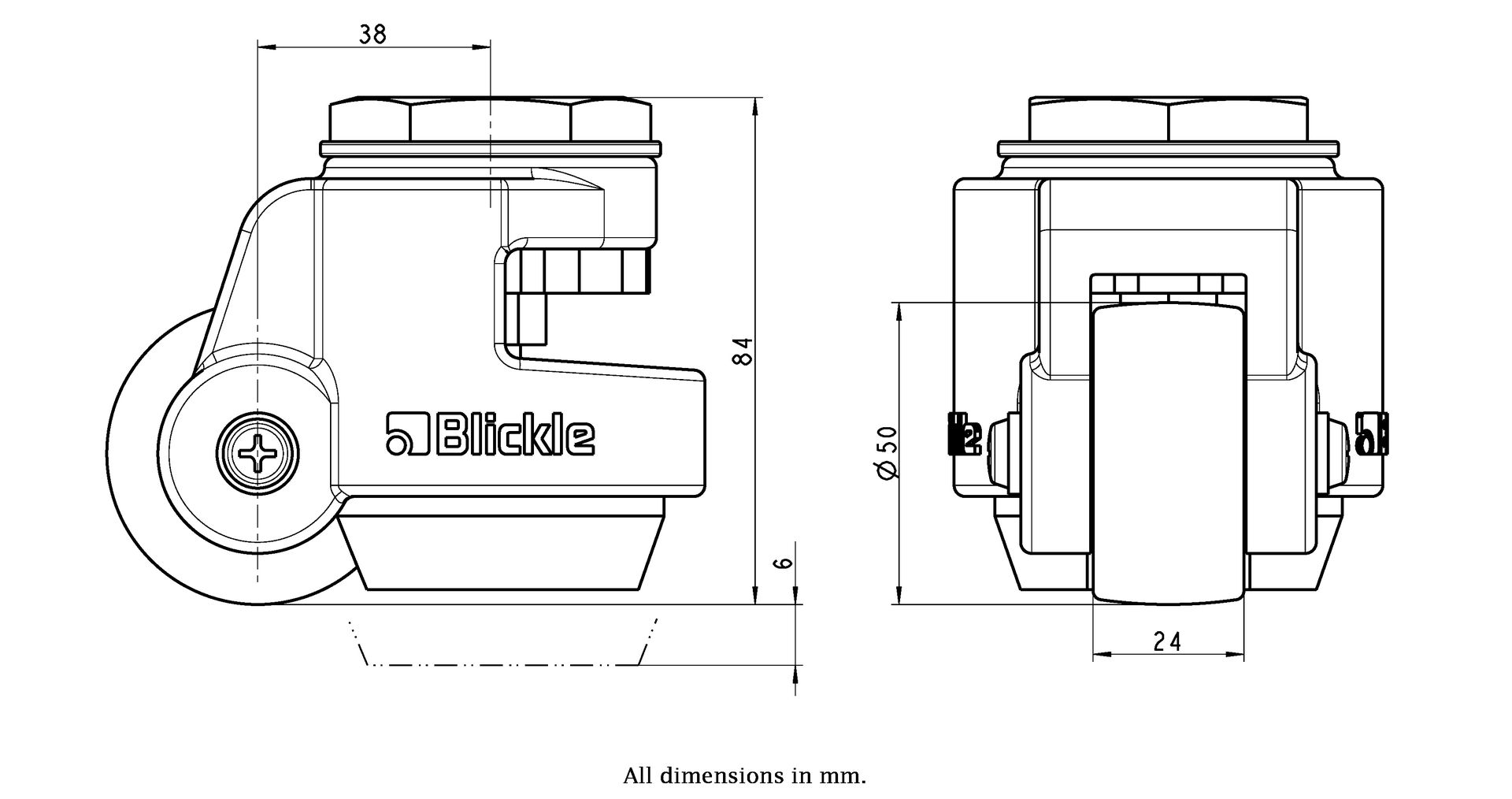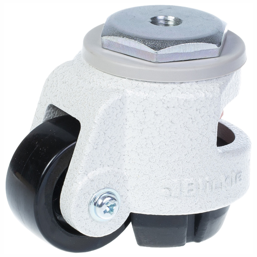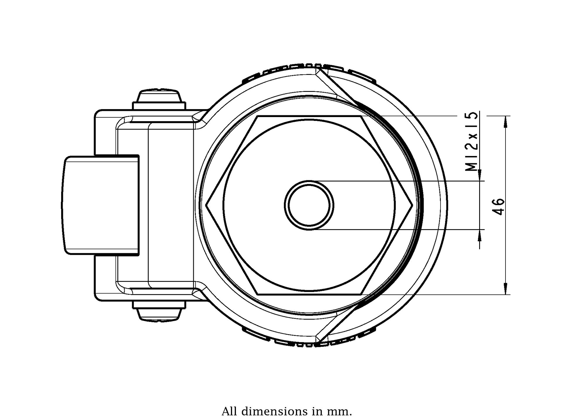 - Levelling swivel castor with zinc plated hexagon steel plate, female thread (M12x15mm) in the single bolt hole.