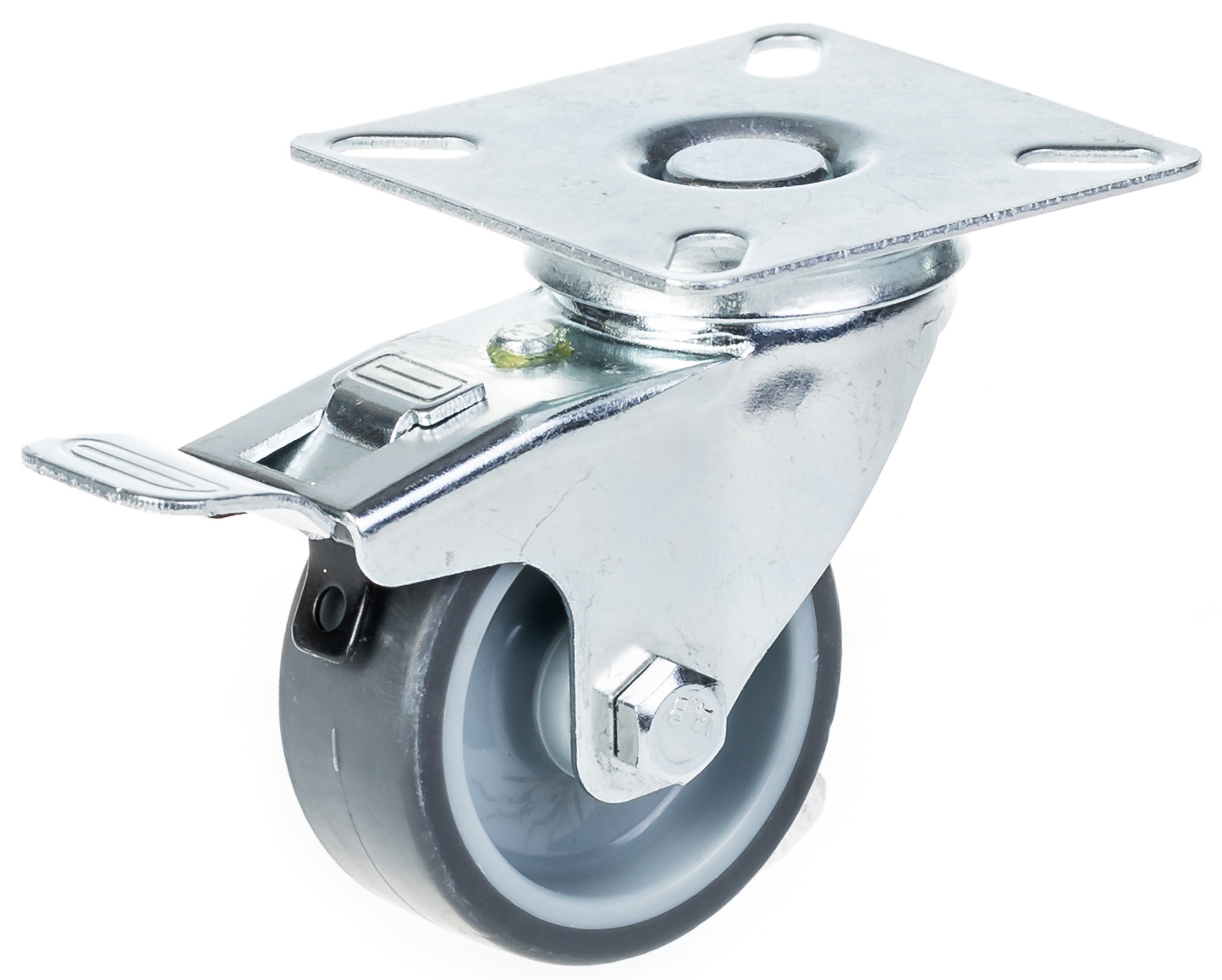 - Swivel/brake castor with top plate bracket made of zinc plated steel with double row ball race in swivel head.