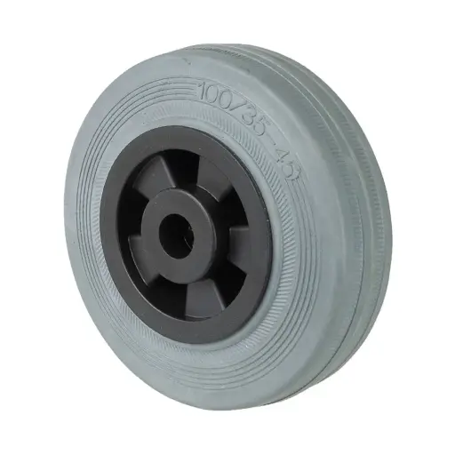 A80.105 Wheel series 100mm grey thermoplastic rubber on polypropylene centre 8mm bore hub length 28mm plain bearing 90kg