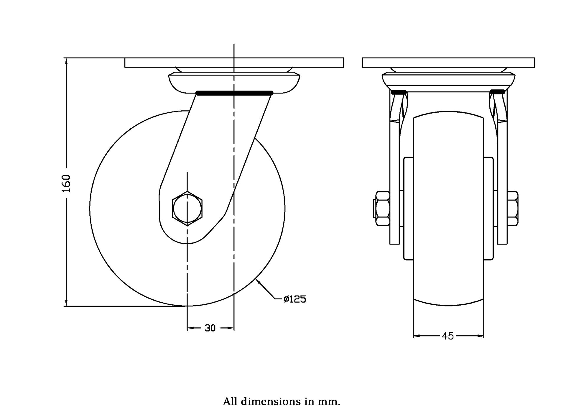 - Swivel castor with strong top plate bracket made of zinc plated steel with double row ball race in swivel head.