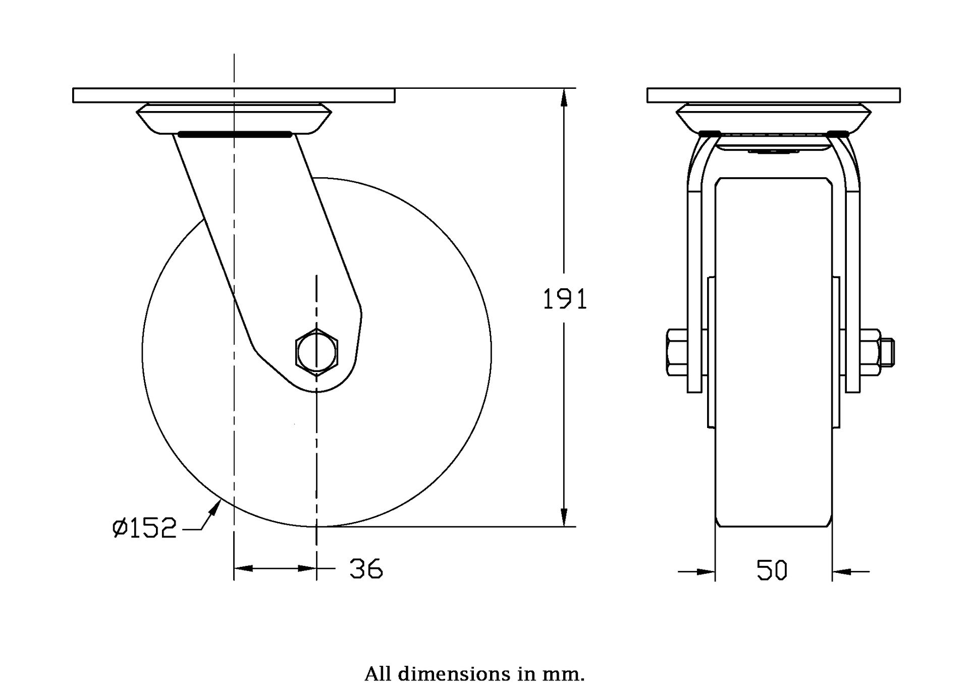 - Swivel castor with strong top plate bracket made of zinc plated steel with double row ball race in swivel head.