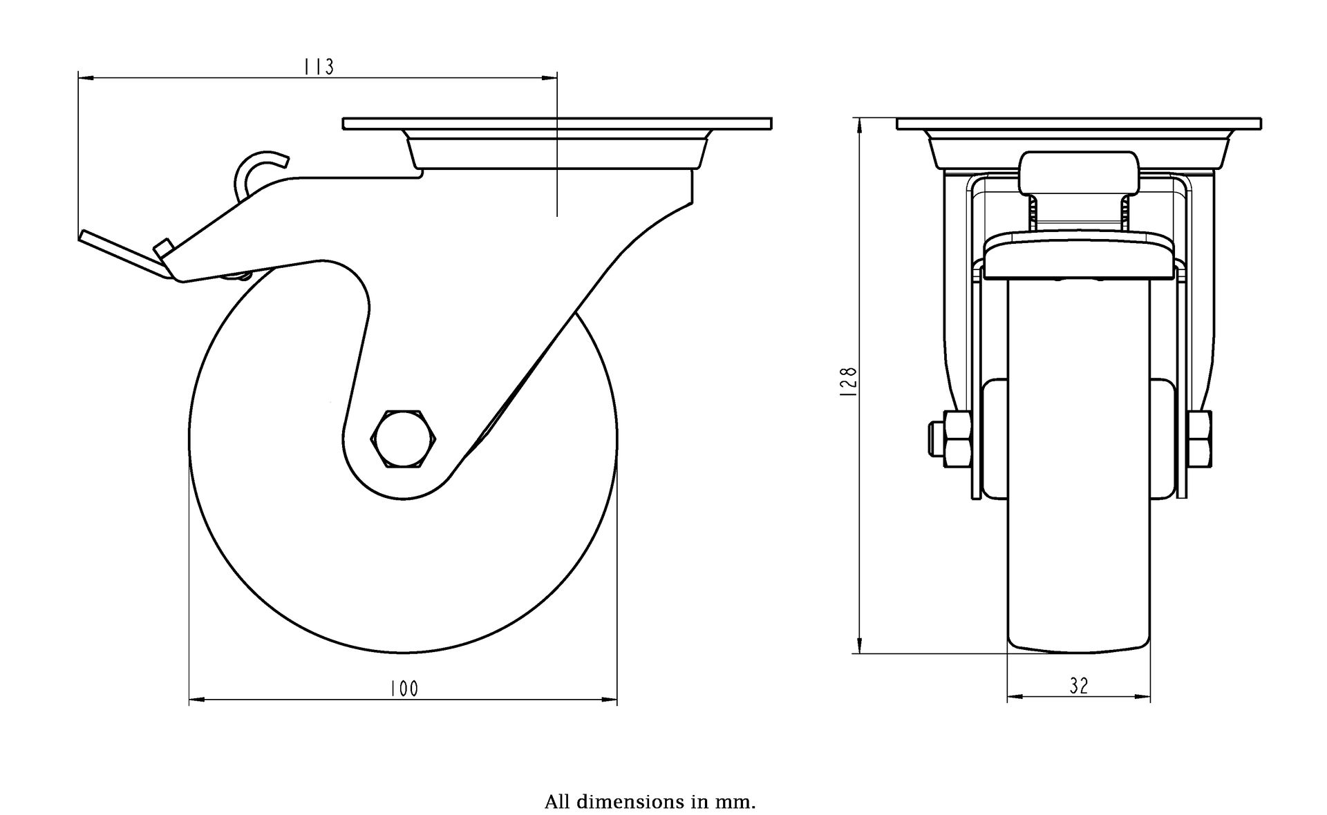 100mm stainless steel swivel/brake castor with white nylon wheel