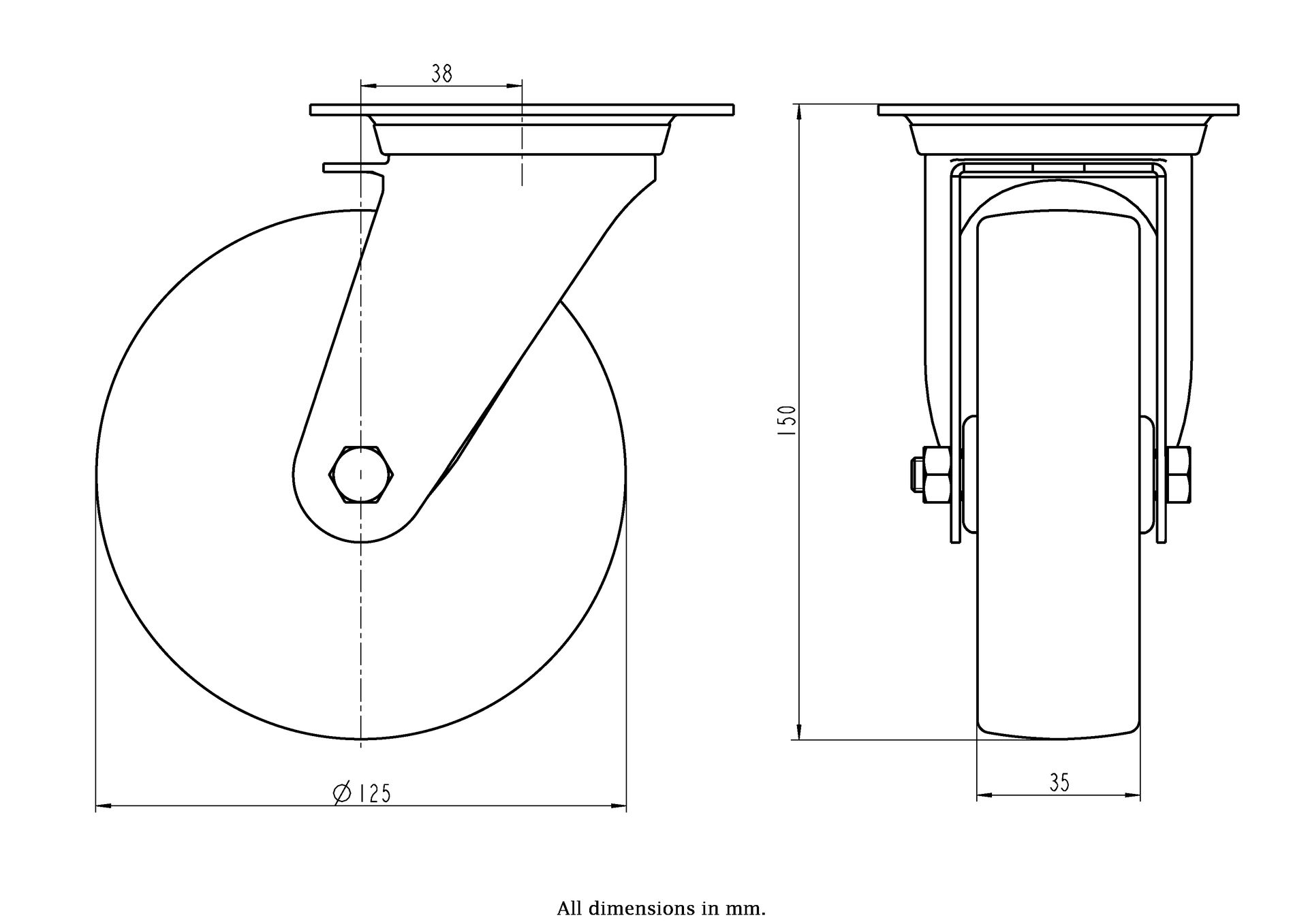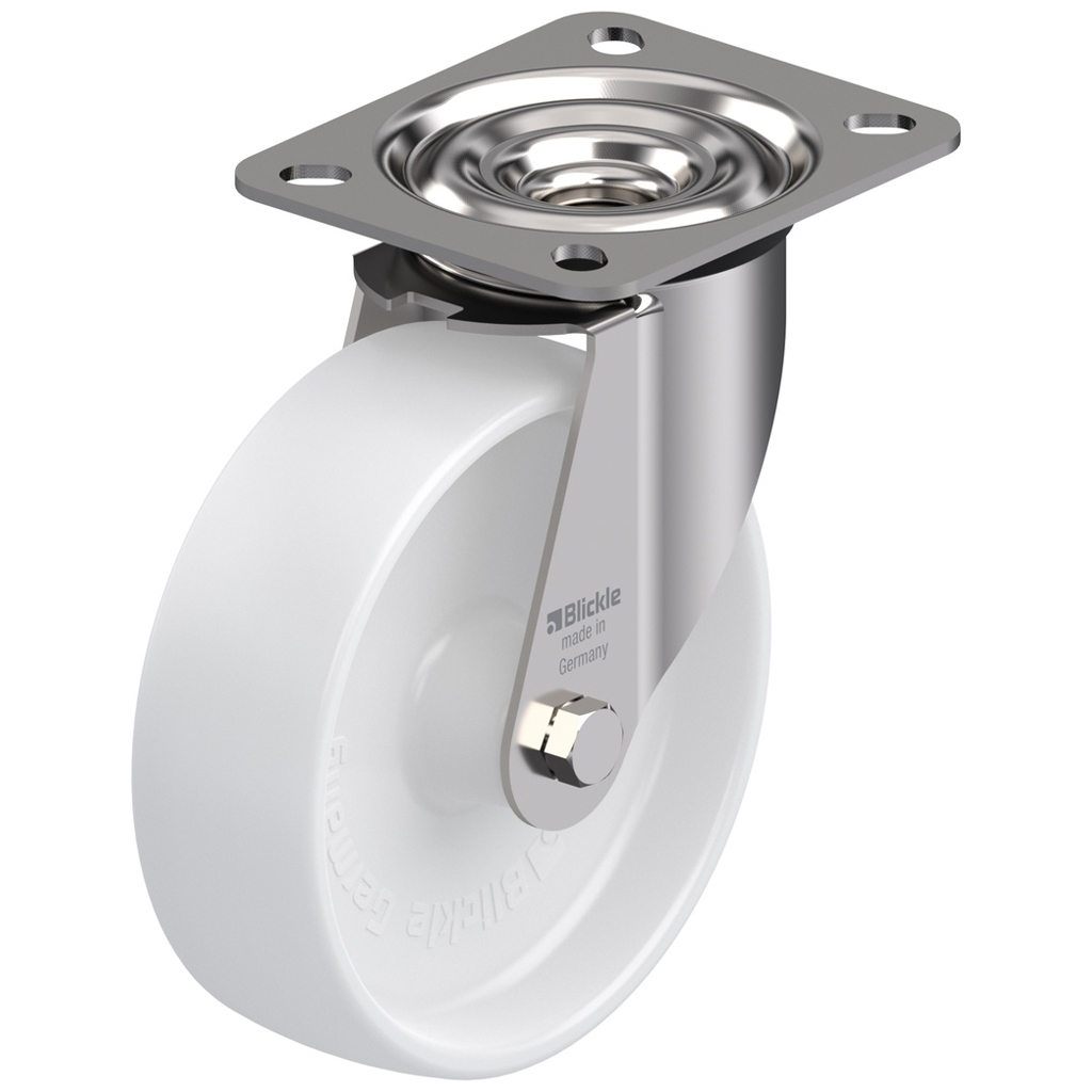 Swivel castor with top plate bracket made of stainless steel with double row ball race in swivel head (material no. 1.4301/AISI 304), with dust protection ring.