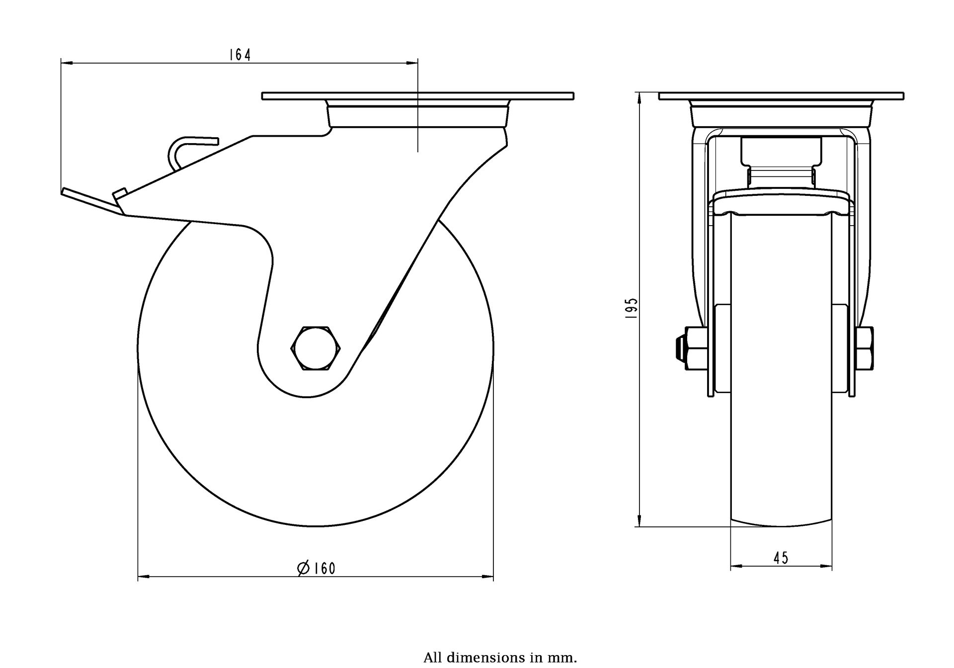 160mm stainless steel swivel/brake castor with white nylon wheel