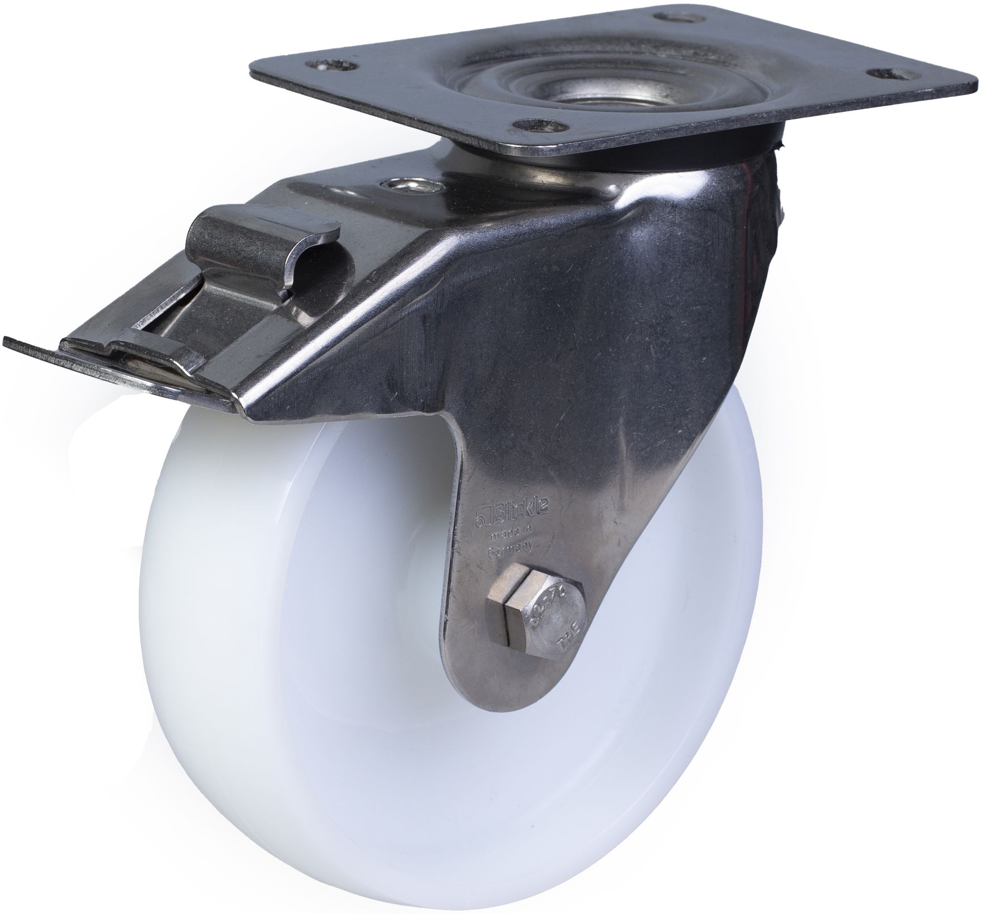 - Swivel/brake castor with top plate bracket made of stainless steel with double row ball race in swivel head (material no. 1.4301/AISI 304), with dust protection ring.