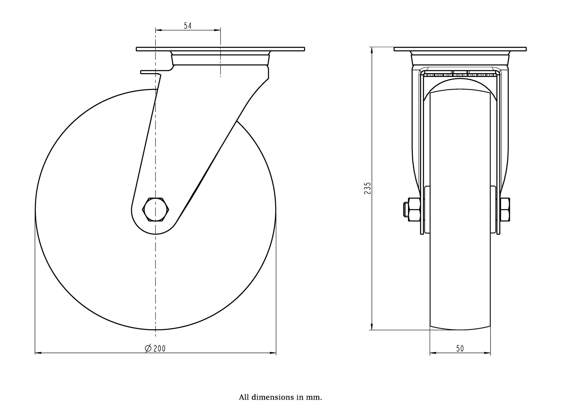 Swivel castor with top plate bracket made of stainless steel with double row ball race in swivel head (material no. 1.4301/AISI 304), with dust protection ring.