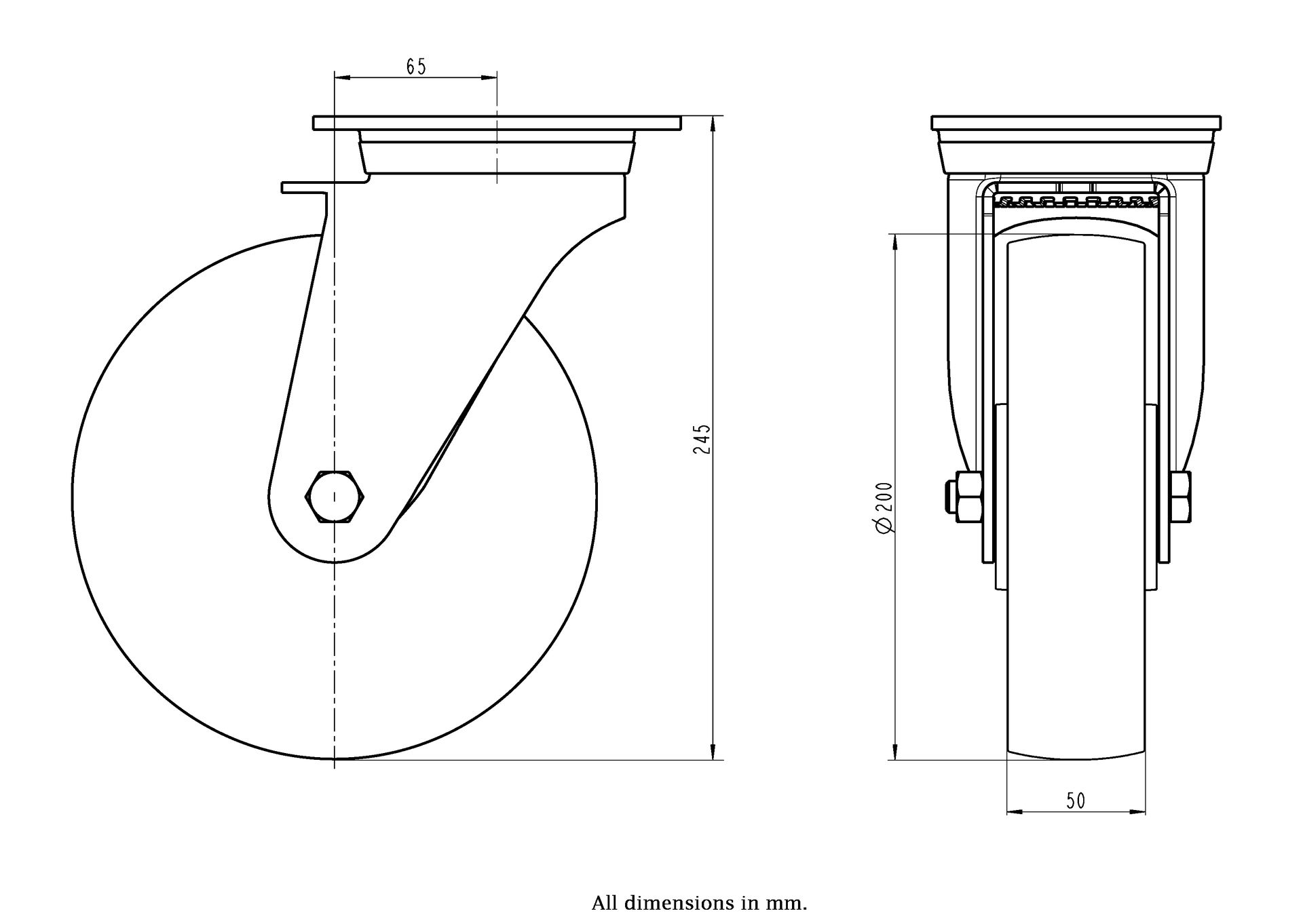 Swivel castor with strong top plate bracket made of stainless steel with double row ball race in swivel head (material no. 1.4301/AISI 304), with dust protection ring.