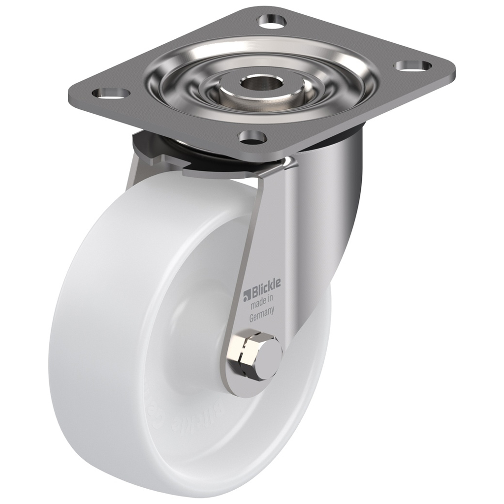 Swivel castor with top plate bracket made of stainless steel with double row ball race in swivel head (material no. 1.4301/AISI 304), with dust protection ring.