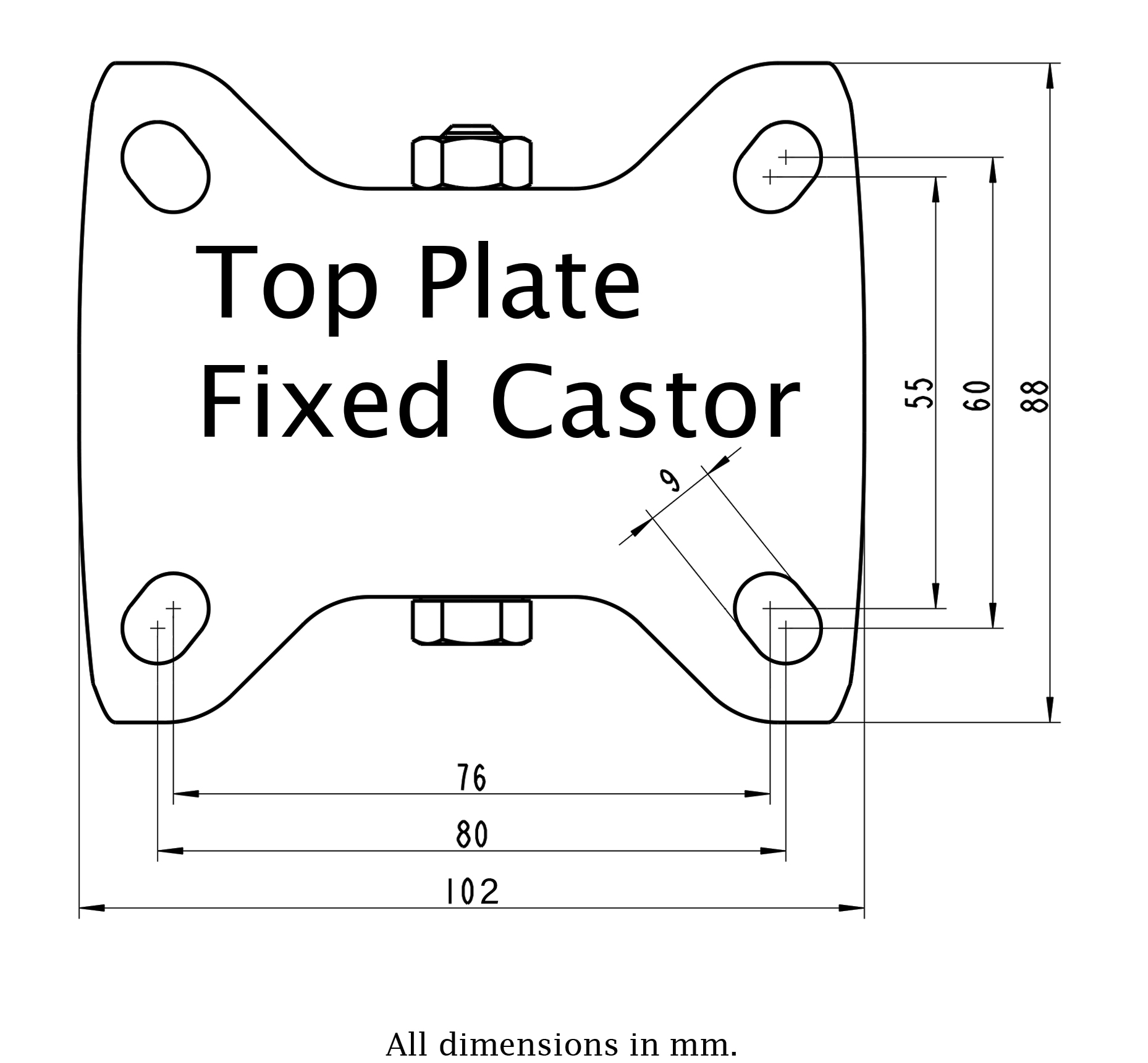 Fixed castor with strong top plate bracket made of stainless steel (material no. 1.4301/AISI 304).
